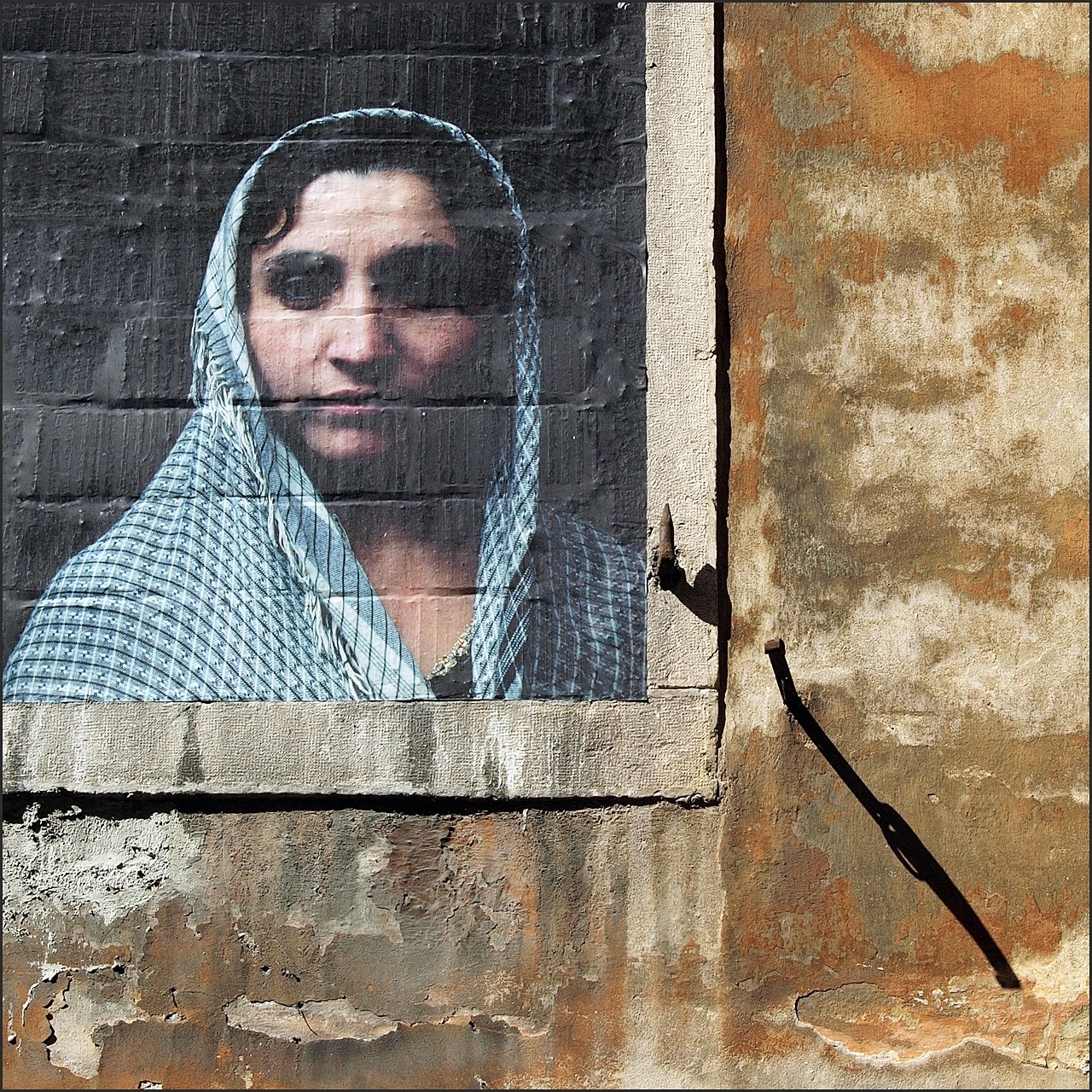 E' la prima volta che vedo un muro wrappato (o ricoperto con plastica adesiva stampata,per dirla in italiano). Bella composizione,luce dura che esalta la decadenza dell'intonaco contrapposta alla delicatezza dell' immagine sacra. Taglio scelto perfetto per il contesto. Molto particolare.