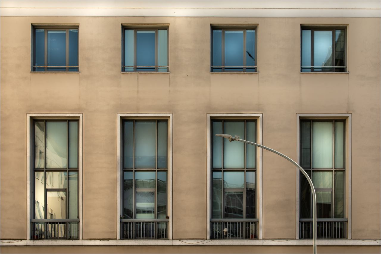 Ben composta nelle due fasce superiore e inferiore. Anche il lampione a spezzare la cadenza ritmica delle finestre ci sta bene.