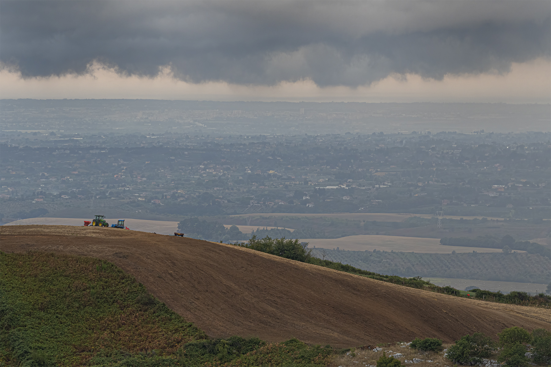 Paesaggio ben composto e gradevole con grande senso di profondita' data dalla foschia dell'aria sempre piu' insistente fino ad arrivare all'orizzonte visivo. La vastita' dello spazio aperto viene ulteriormente accentuata dalle minuscole figure dei trattori su quel bel pendio in primo piano. E' un'immagine molto sincera e senza fronzoli , pochi aggiustamenti in PP senza particolari stravolgimenti. Come sempre , il tutto secondo mia personalissima opinione.
