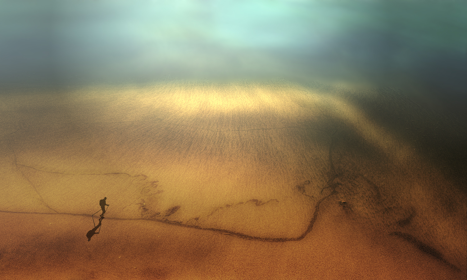 Un trekker che avanza tranquillo in un percorso con qualche distrazione ma senza asperità, sorretto da una luce che accompagna il suo cammino... Onirica al pari delle altre, nel complesso la vedo positiva.