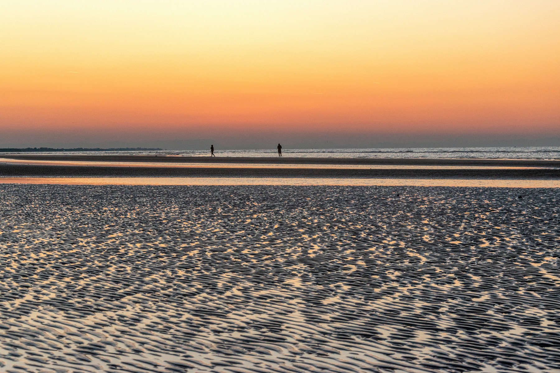 Mi piace molto la texture valorizzata dalla luce del tramonto e la suddivisione in fasce del fotogramma con le due silhouette solitarie all'orizzonte