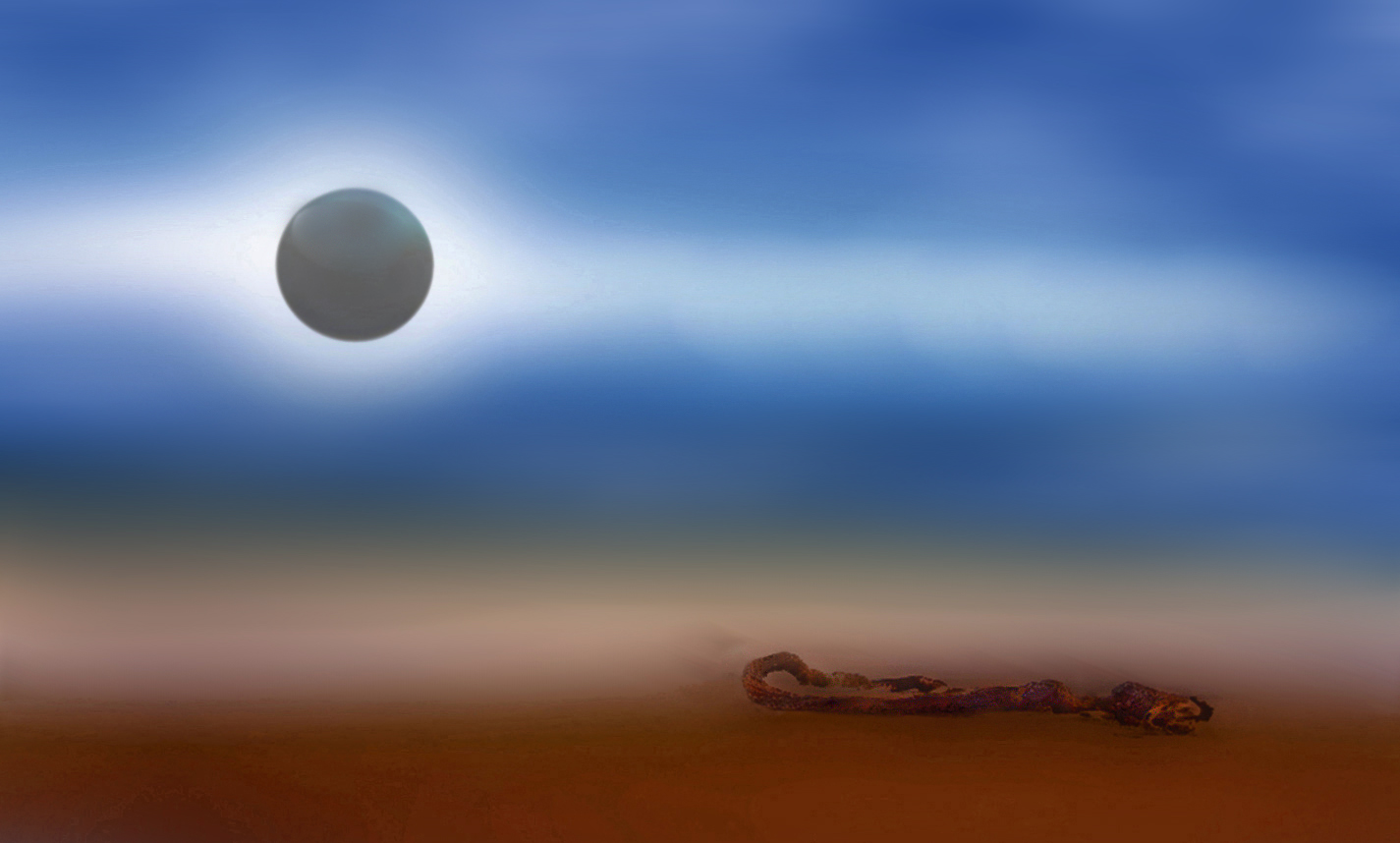 Un’immagine primordiale… o futuristica, chissà… in ogni caso minacciosa e non bastano i colori vivaci a bilanciare l’angoscia del sole oscurato. Emblematica.