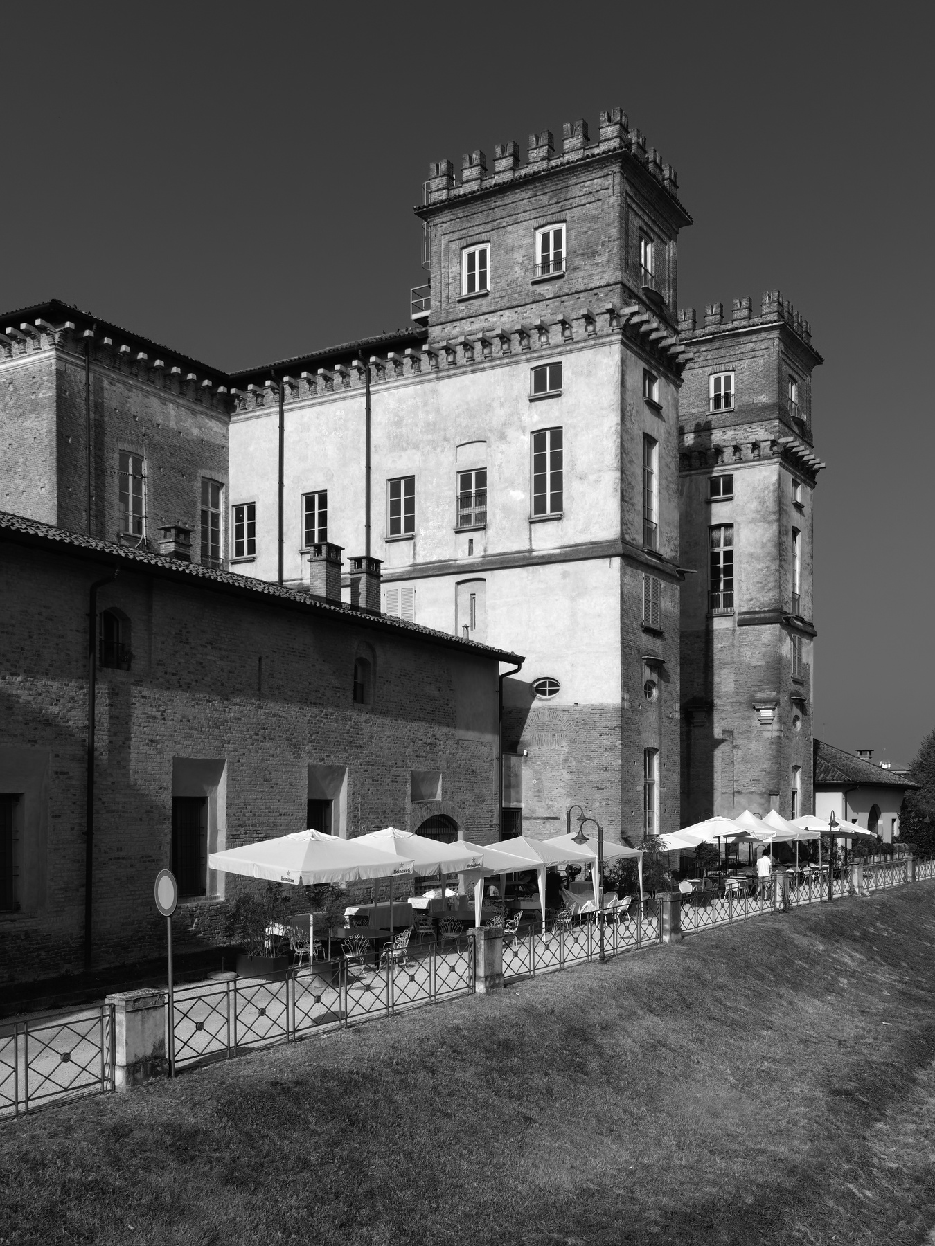 Composta bene , sobria,con un BN moolto controllato per evitare botte inutili su quella facciata cosi' chiara. E' strana perche' non c'e' un 'anima seduta ai tavoli,solo una fugace figura umana di spalle che se ne va. Ho trovato un sacco di questi castelli/fortezze/manieri nei paesini in Lomellina,una volta erano le residenze dei "potenti" della zona.