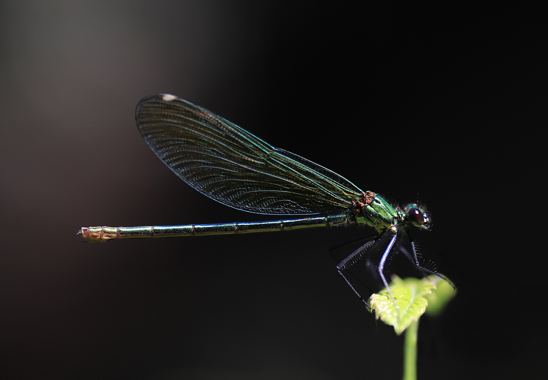Scatto con esposizione a spot, libellula in piena luce su sfondo in ombra.