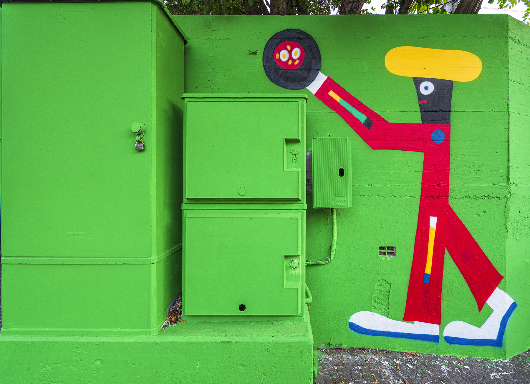 Un buon modo per camuffare delle antiestetiche cassette tecniche… Composizione colorata e gradevole.