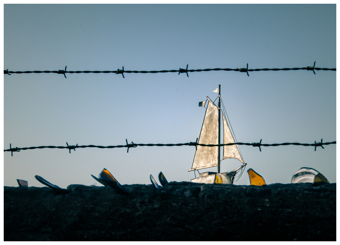 Un navigare tra cocci di vetro e filo spinato....il titolo c'è tutto. Una bella e particolare foto, ben realizzata.