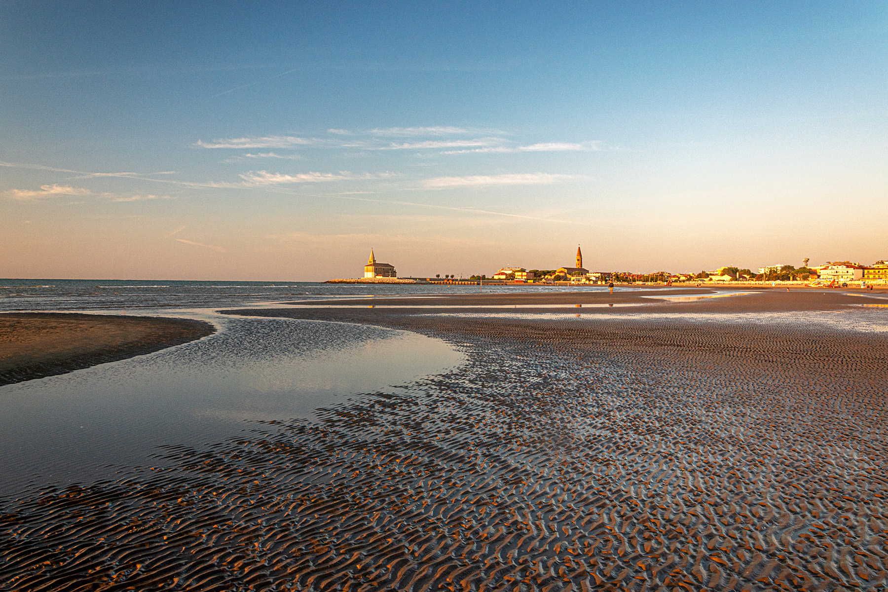Personalmente eliminerei buona parte del cielo per un taglio panoramico, l'immagine si sviluppa tutta in basso con un bellissimo pp e disegni sul bagnasciuga...bella la luce ma da sistemare localmente sul caseggiato dove è un po altina e fa perdere il dettaglio. Pende leggermente a dx.