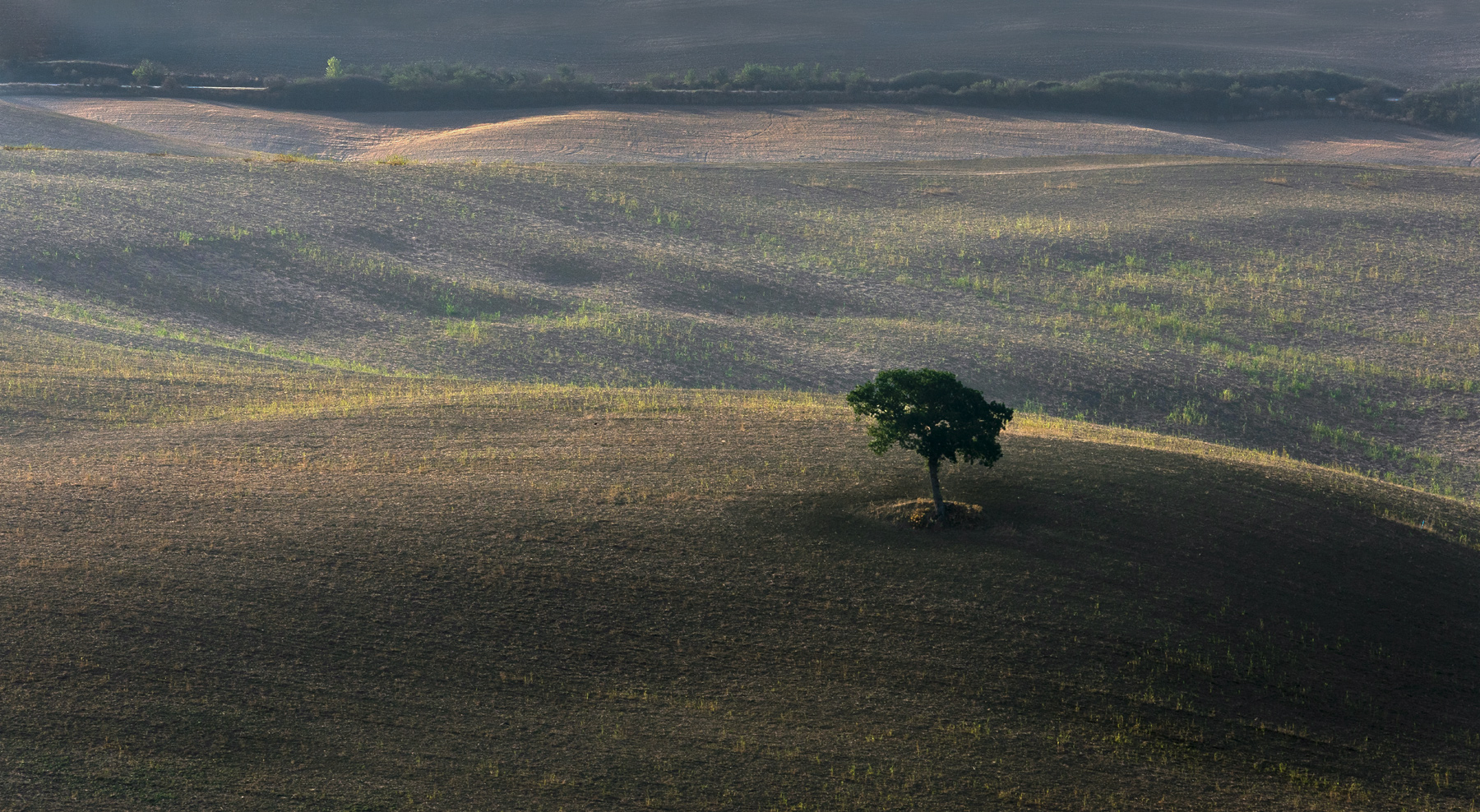 Godibilissima...bella la luce che accarezza la ricrescita dell'erba su queste dolci avvallamenti collinari, e l'albero solitario a far da guardiano.