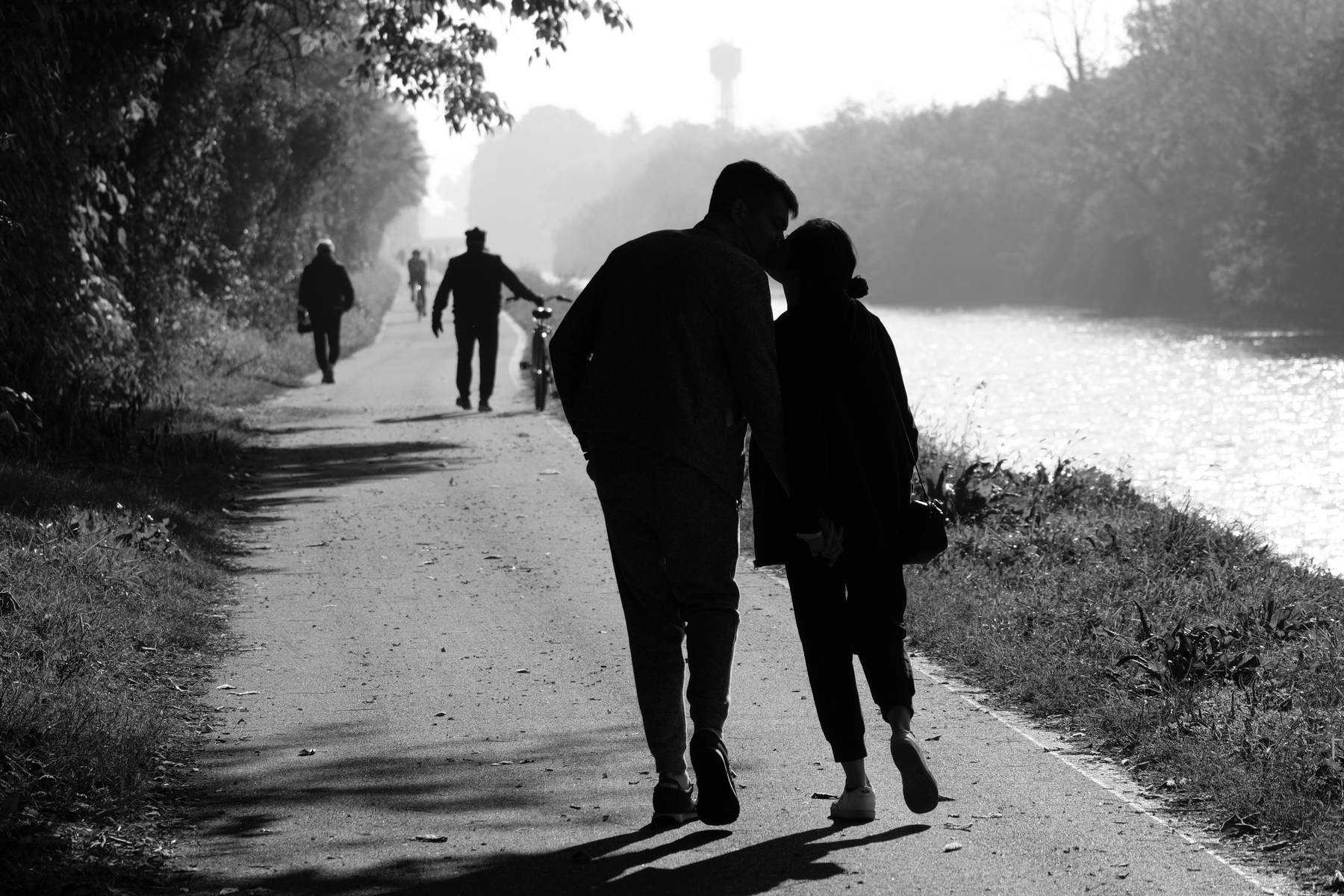 | Una bella istantanea che ferma lo svolgimento della vita su questa stradina che lambisce il torrente. Amori in corso, camminate e pedalate alla ricerca di un momento di pausa ristoratrice, il tutto reso in un ottimo bianco e nero in controluce. Bella. Ciao, Tiziano |