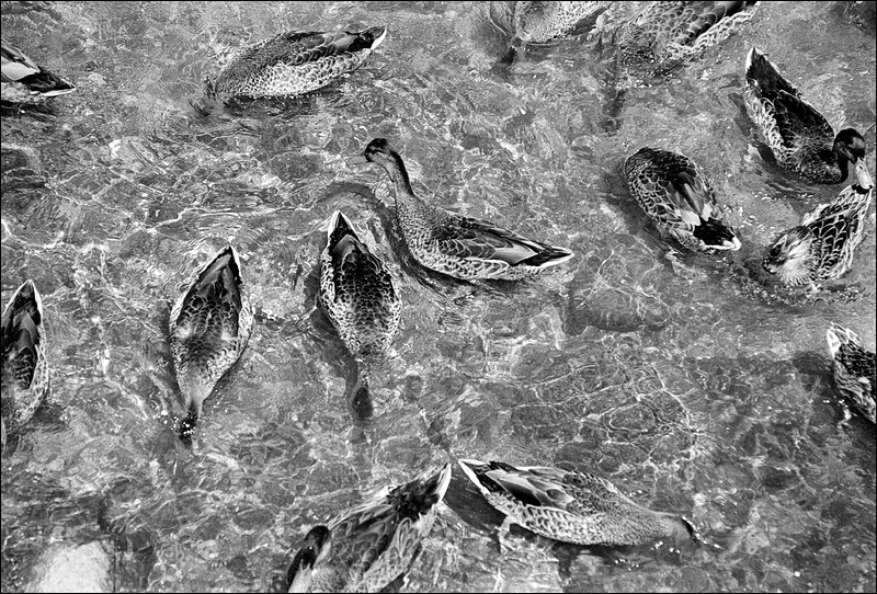 Particolare punto di ripresa che,complice l'ottimo bn,accentua il mimetismo delle papere creando un suggestivo gioco ottico che cattura lo sguardo.Molto bella! Ciao,Sergio.