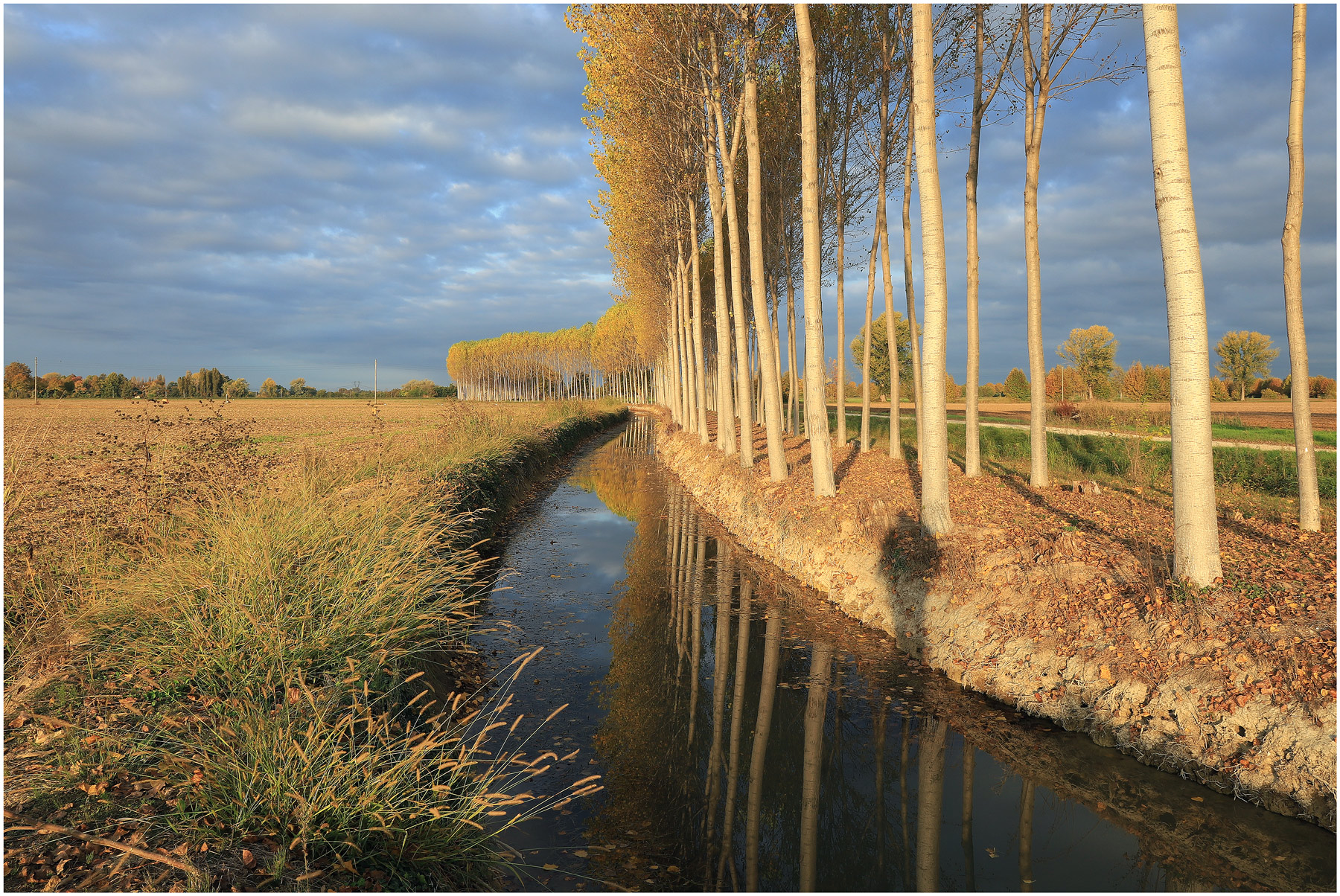 Mi piace, in primis la composizione dinamica, sinuosa e narrativa tra curve acquee e filari arborei.