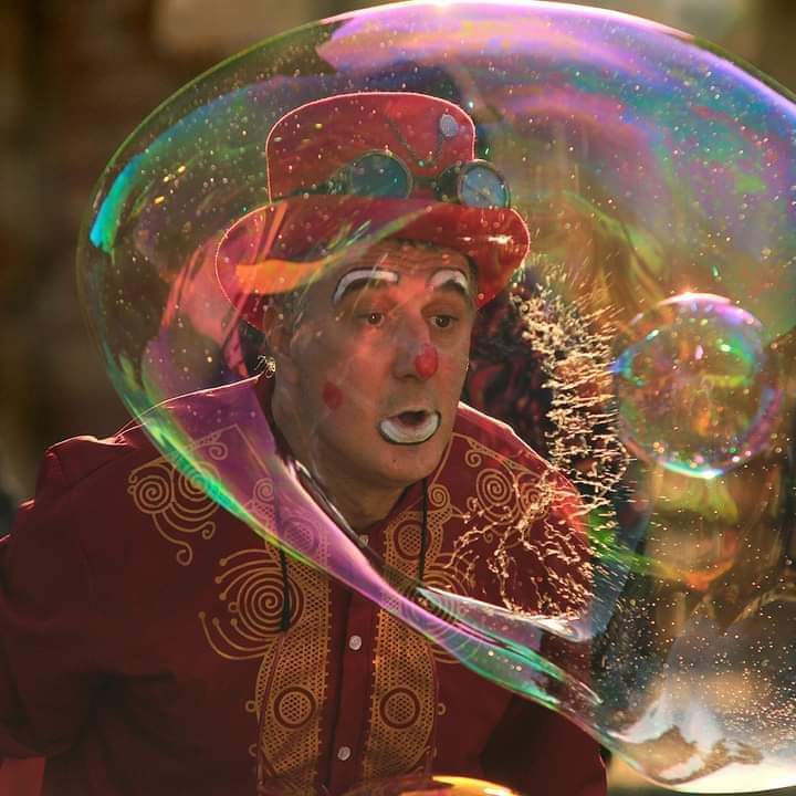 Belli i colori, bello il tempismo... Bello il momento... Le bolle sono magie...i clown sono gioco e allegria...eppure la sua espressione seppur concentrato ha un non so che di malinconico. Complimenti per questa cattura,attesa cercata e riuscita!
