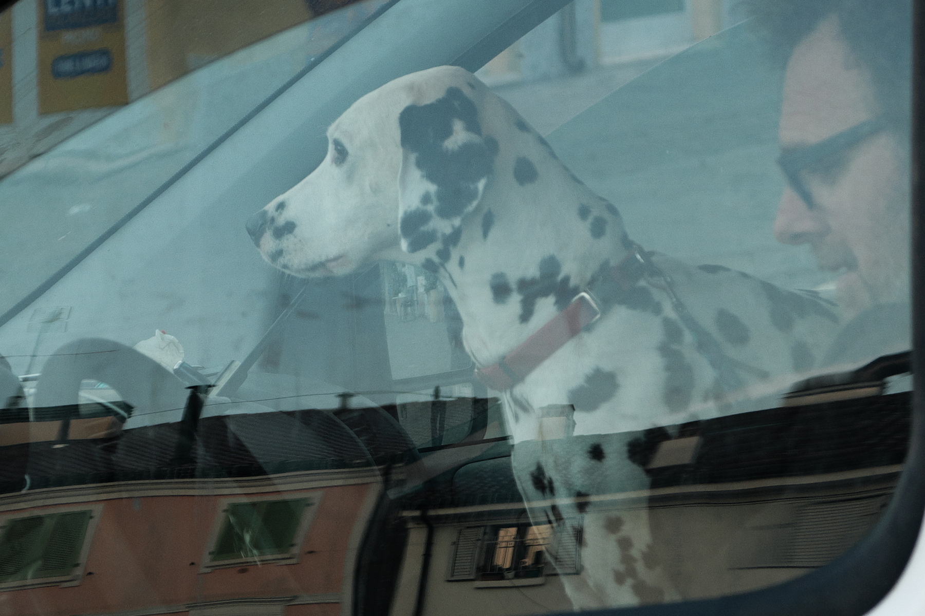 In tutta onesta' non riesco a percepire l'intento dietro lo scatto,eccetto la testimonianza visiva di un cane dentro un'automobile. Forse si potrebbe leggere qualcosa legato al connubio uomo-animale grazie alla risicata presenza della figura umana, ma IMHO risulta un po' debole per sorreggere la foto.