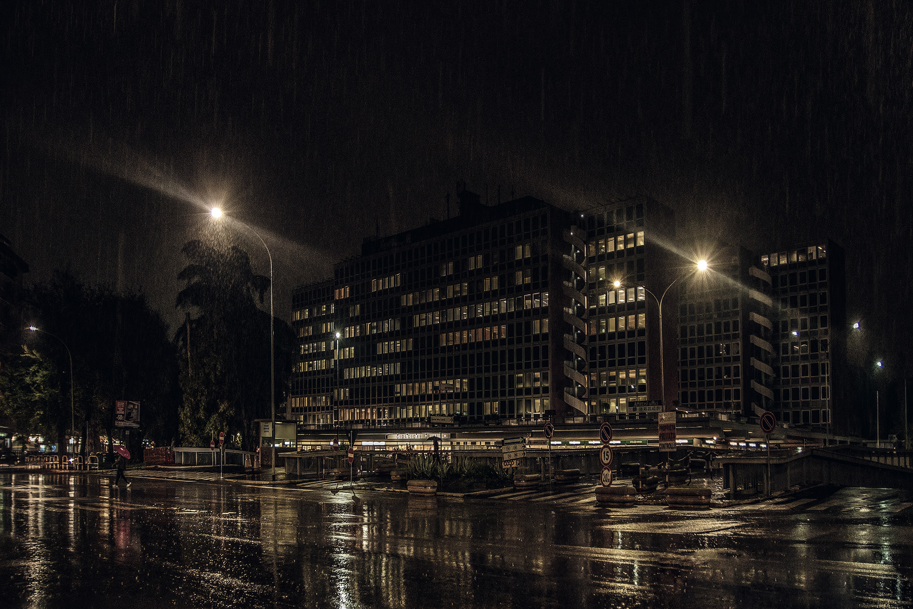 Bella la resa anche dei filamenti della pioggia illuminata dai lampione il grosso palazzo con tante finestre accese.