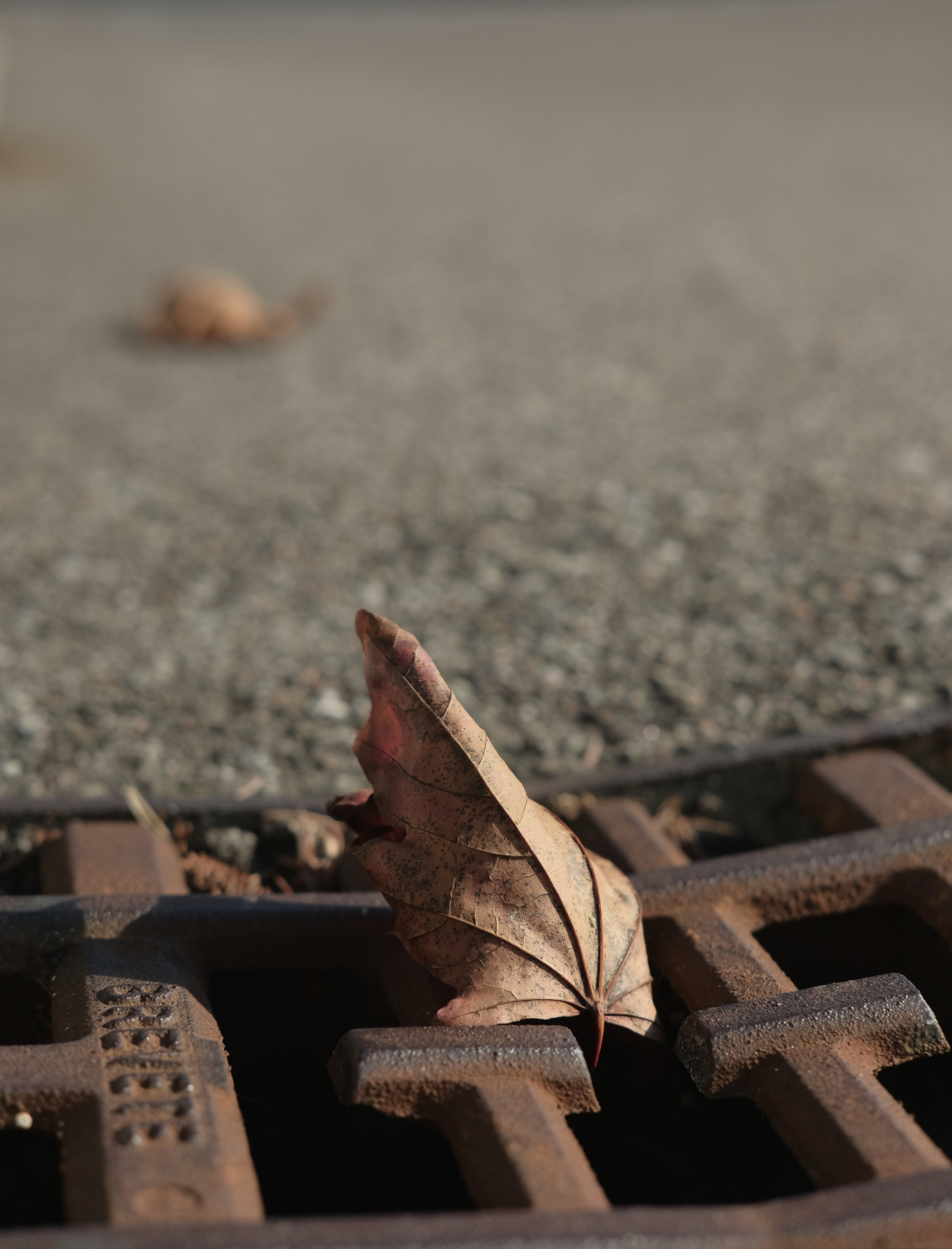 Mi piace questa ripresa raso terra, con foglia protagonista che sembra aggrappata al tombino per non esserne inghiottita. Il fuori fuoco dietro lascia intravedere una seconda foglia, da cui il titolo