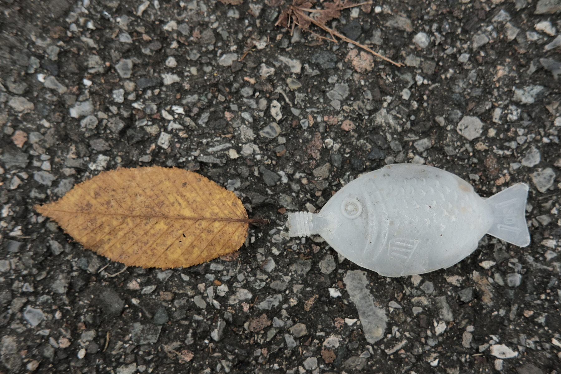 Il pesce e la foglia dalle forme similari in fila indiana . Immagino un bimbo che le ha posizionate a terra con cura per poi dimenticarle attirato da altro...ma il gioco non è sfuggito al tuo occhio attento e l'hai immortalato con la tua consueta perizia