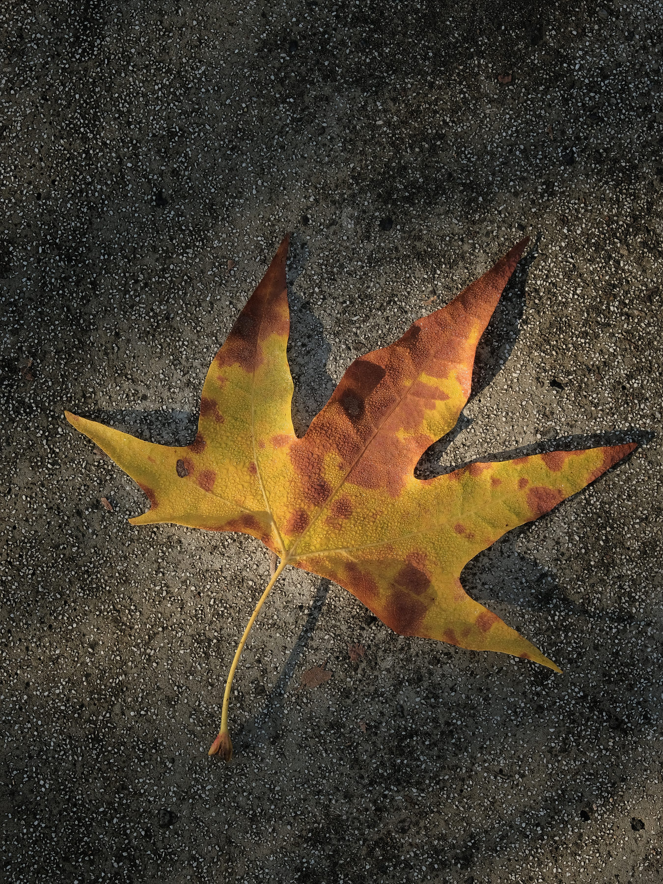 Una luce morbida ma decisa cade proprio ad illuminare la foglia sul pavimento e permette di apprezzarla in tutta la sua bellezza variopinta di colore autunnale.