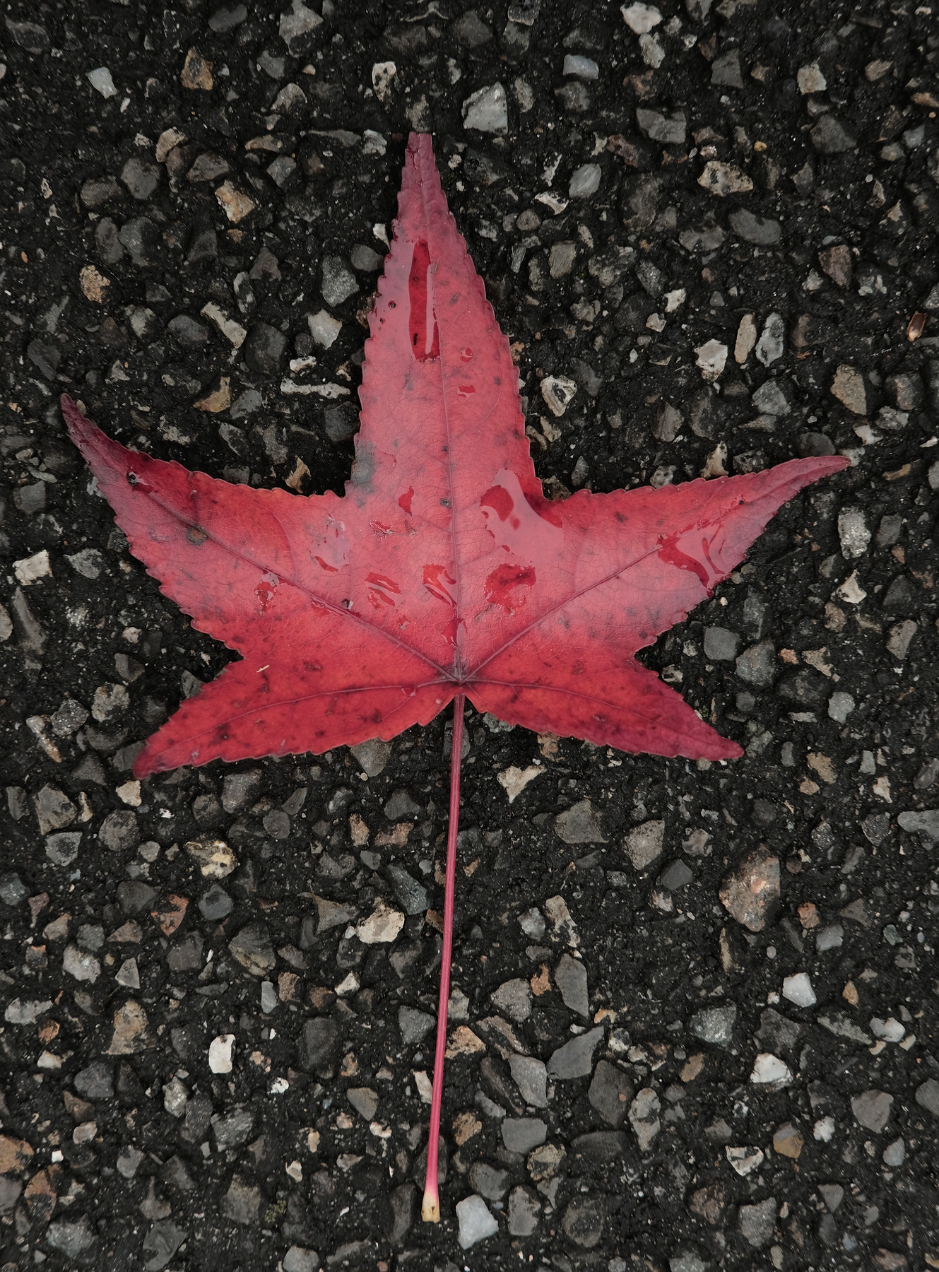 Piccole gocce.. su questa bella foglia di acero che la rendono ancor più splendente ed ammirabile in tutti i suoi dettagli.. poi distesa su quell'asfalto dai colori grigi, neri, bianchi..il suo rosso è meraviglioso. Mi piace molto questa composizione