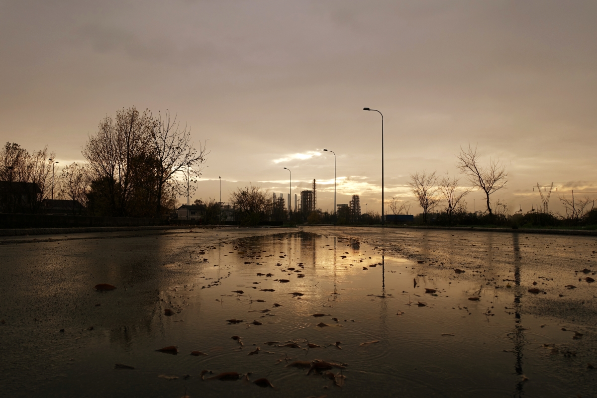 Una foto che coglie con malinconia l'aspetto periferico di certe zone cittadine. Le foglie e la pioggia intrisa di depositi terrosi stratificati nel tempo restituiscono un forte senza di abbandono urbano. Anche la luce tristemente elegiaca contribuisce a sortire l'effetto.