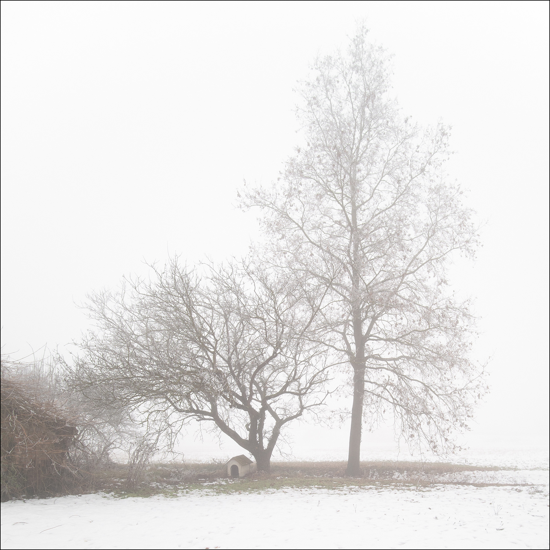 | Il titolo è funzionale all'immagine. Quella cuccia forse un tempo ospitava un amico a quattro zampe che ora non c'è più e la malinconia assale immediatamente. La scena con gli alberi fra neve e nebbia si fa suggestiva e intima. Per me uno scatto ben riuscito. Ciao, Tiziano |