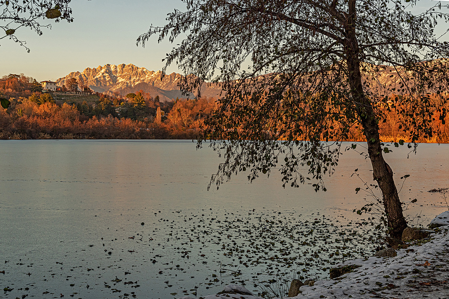 Fantastica, una giornata senza nebbia! Bellissimi i colori caldi dello sfondo e buona la composizione con il contrasto dato da acqua (immobile!) e albero… Mi piace Smile