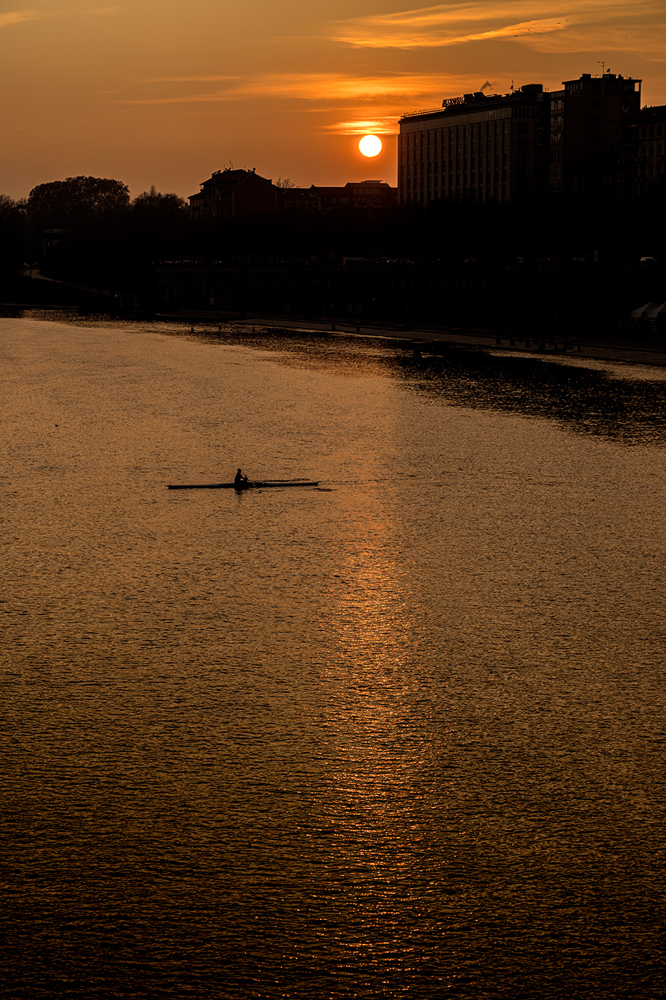 Ottima immagine… per il connubio città e natura, per la composizione essenziale ma completa, per la solitudine del canoista scaldato dai colori del tramonto… mi piace molto!