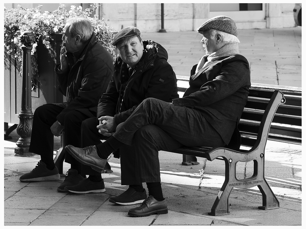 | Una sana chiacchierata fra distinti signori su una panchina di città in una soleggiata giornata invernale restituita con un bianco e nero adeguato che rispecchia correttamente in termini di esposizione fotografica la luce del momento. Buona |