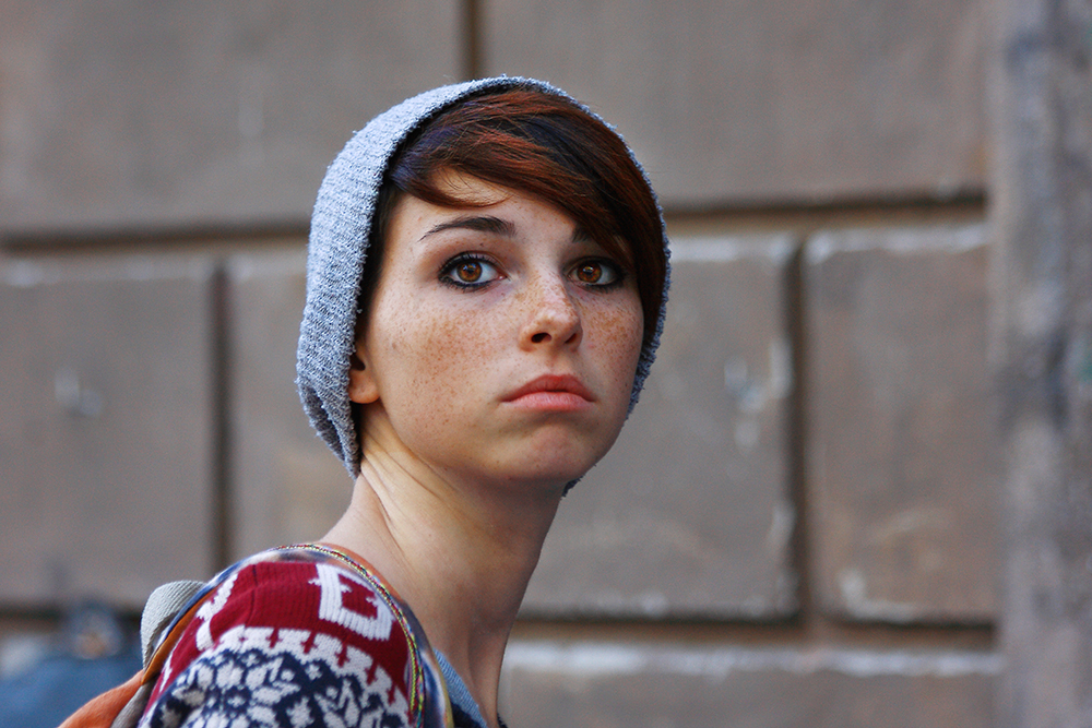 Un ritratto casuale molto bello, anche per quella luce negli occhi e per il berretto che incornicia il viso.