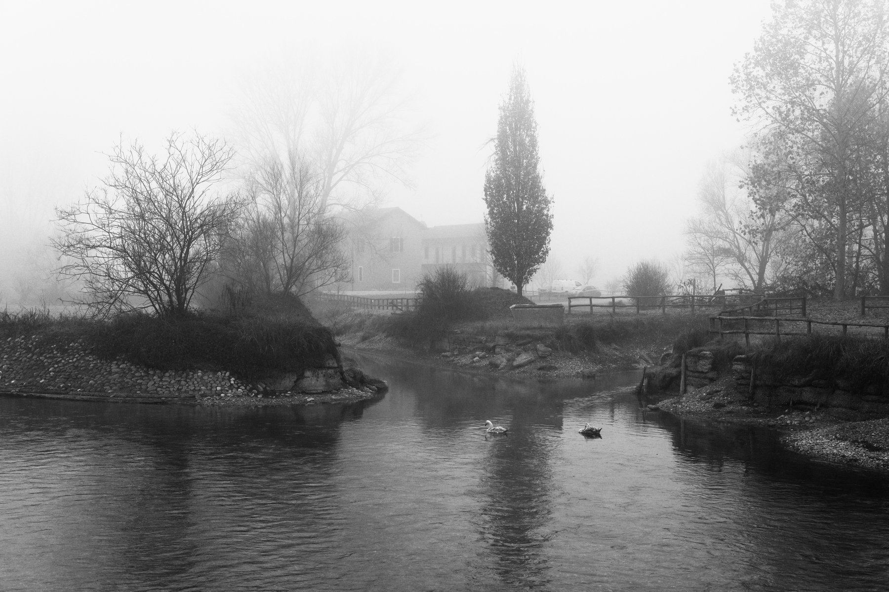 placide atmosfere della bassa, foschia, corsi d'acqua e due cigni ad impreziosire la gia buona composizione