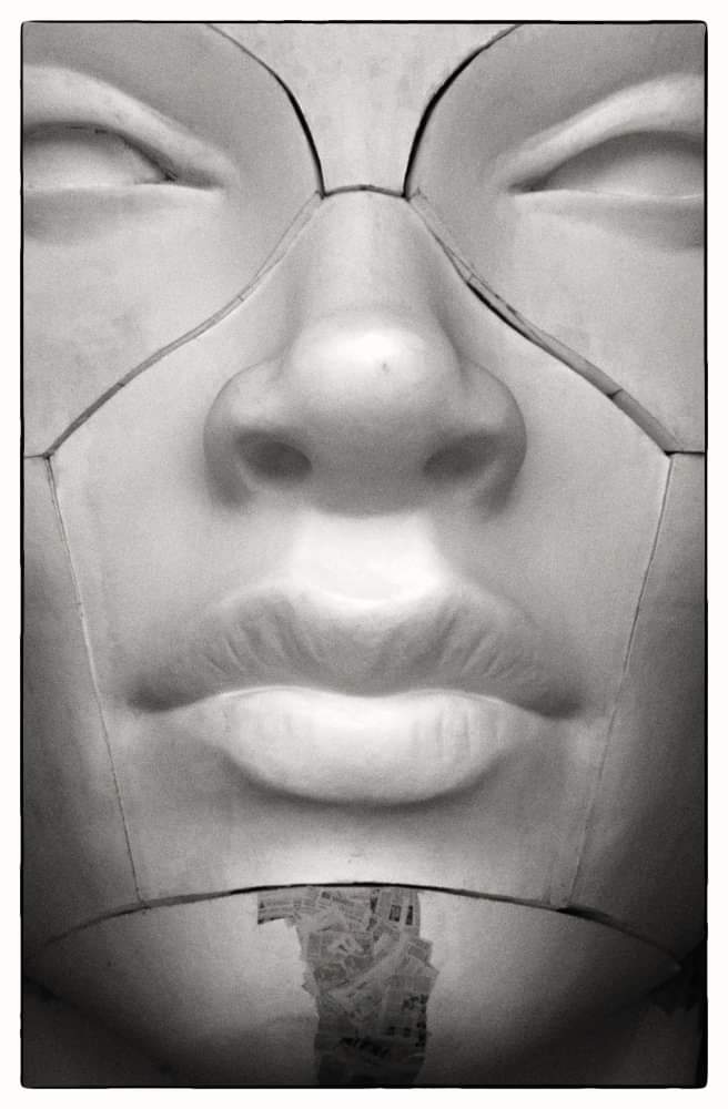 Per me la foto che ho scattato è piuttosto significativa perchè pur essendo ormai quasi terminata questa opera lascia vedere l'anima che la compone, ovvero fogli di giornale e colla che sono visibili al grezzo in un pezzetto del volto ed esattamente al centro della bazza.