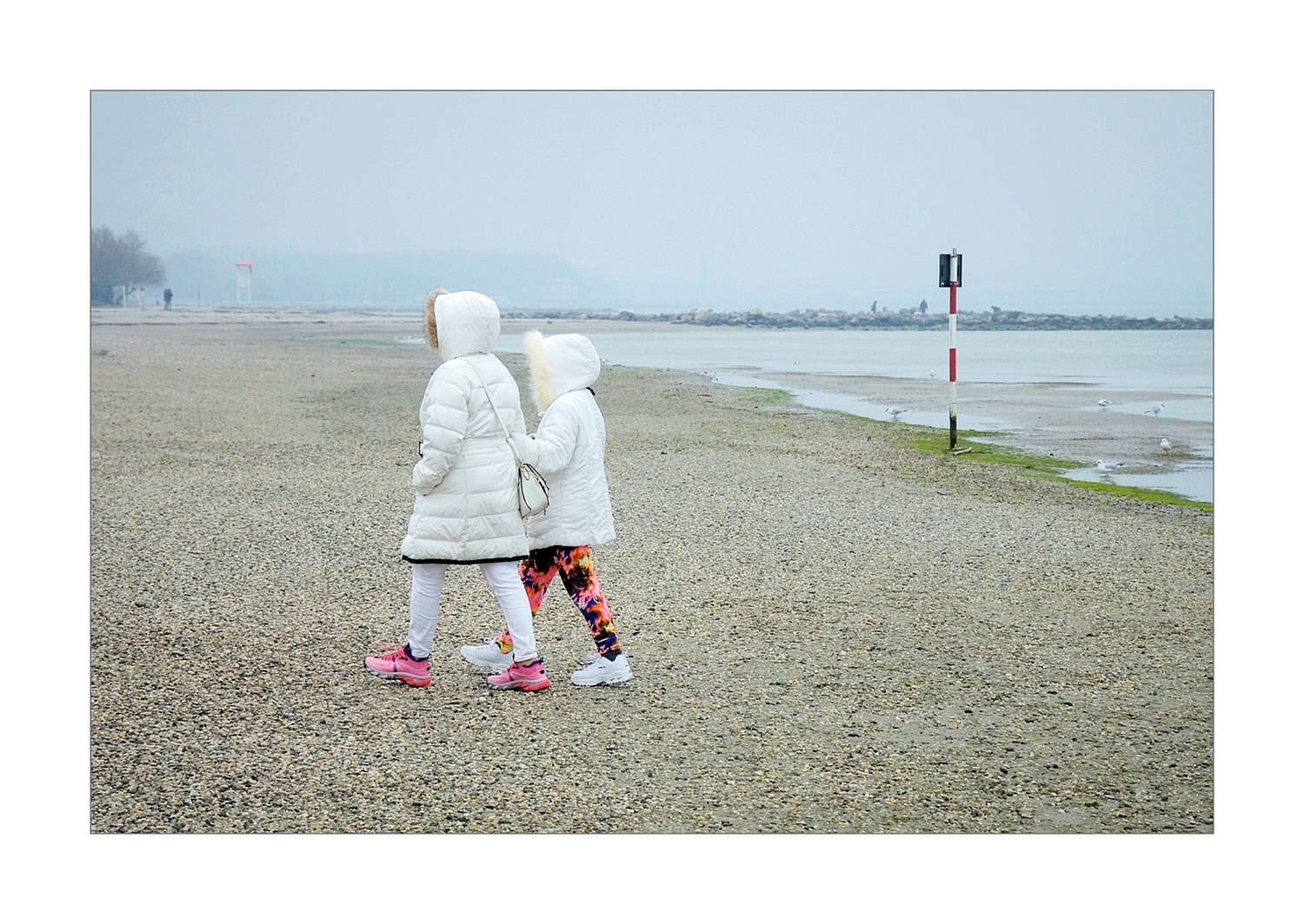 Una cattura molto bella, i colori delle scarpe e pantaloni delle bambine emergono nel bianco con vivacità.. i colori tenui del cielo-mare rendono molto piacevole all'osservatore questa immagine. Mi piace anche la composizione.