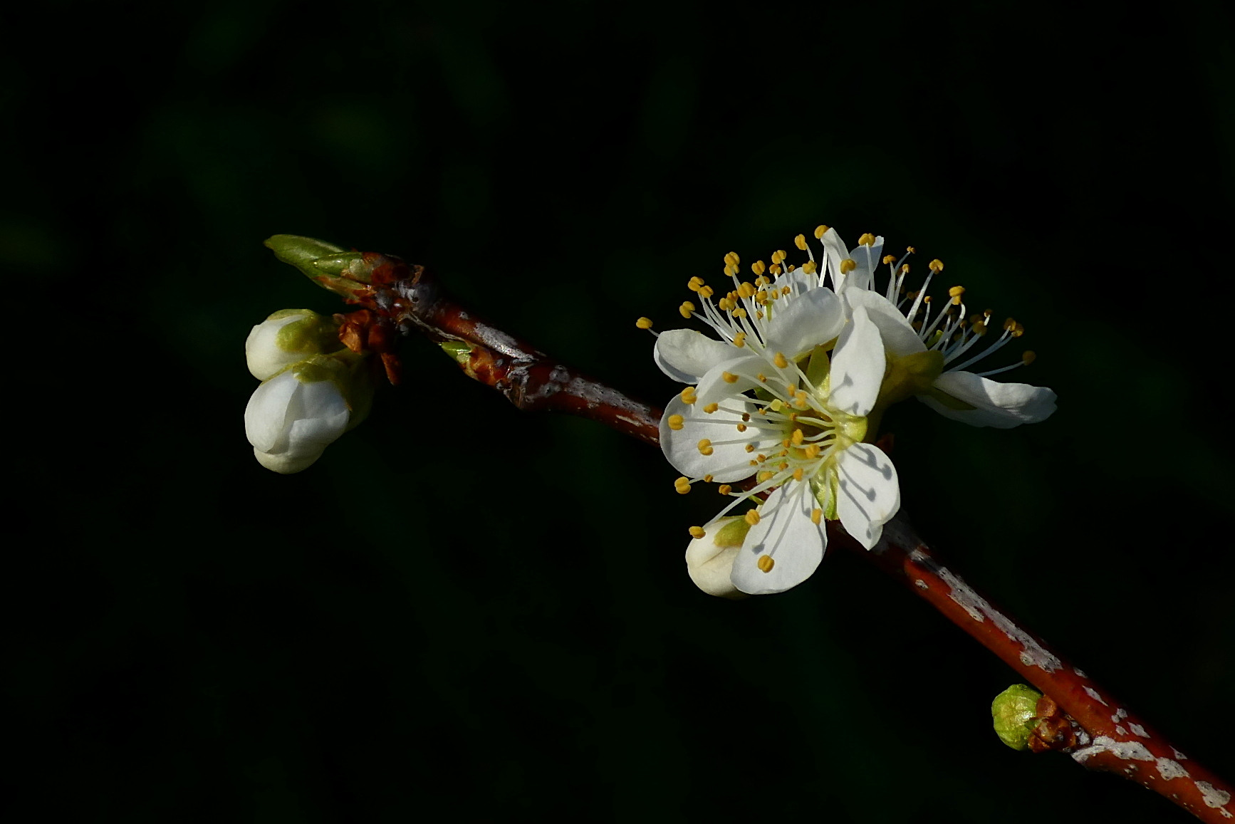 Ben ripresa questa primavera anticipata. Questo ramoscello fiorito stacca molto bene dal fondo nero.