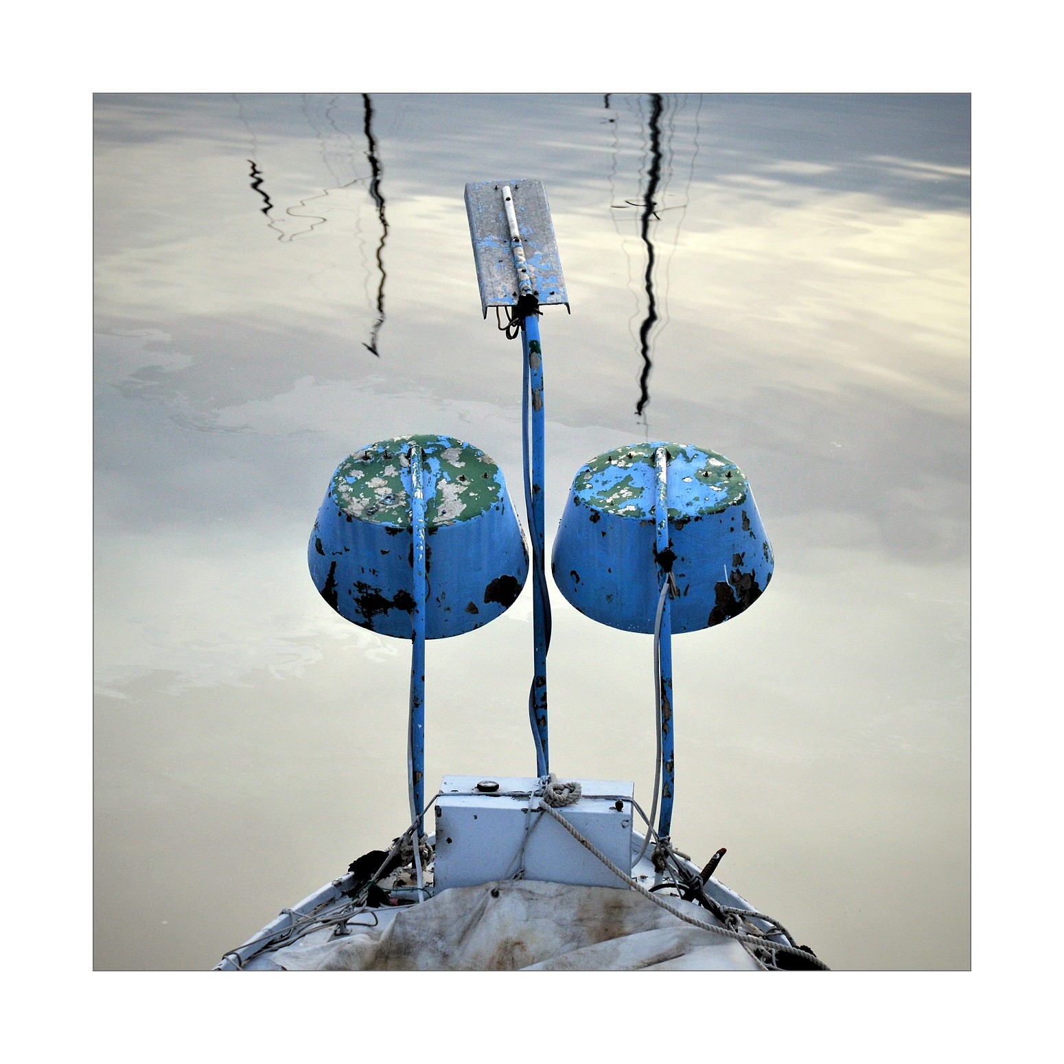 Gli alberi delle barche, riflesse, sembra vadano a colpire come fulmini quei due oggetti azzurri. Ben vista!