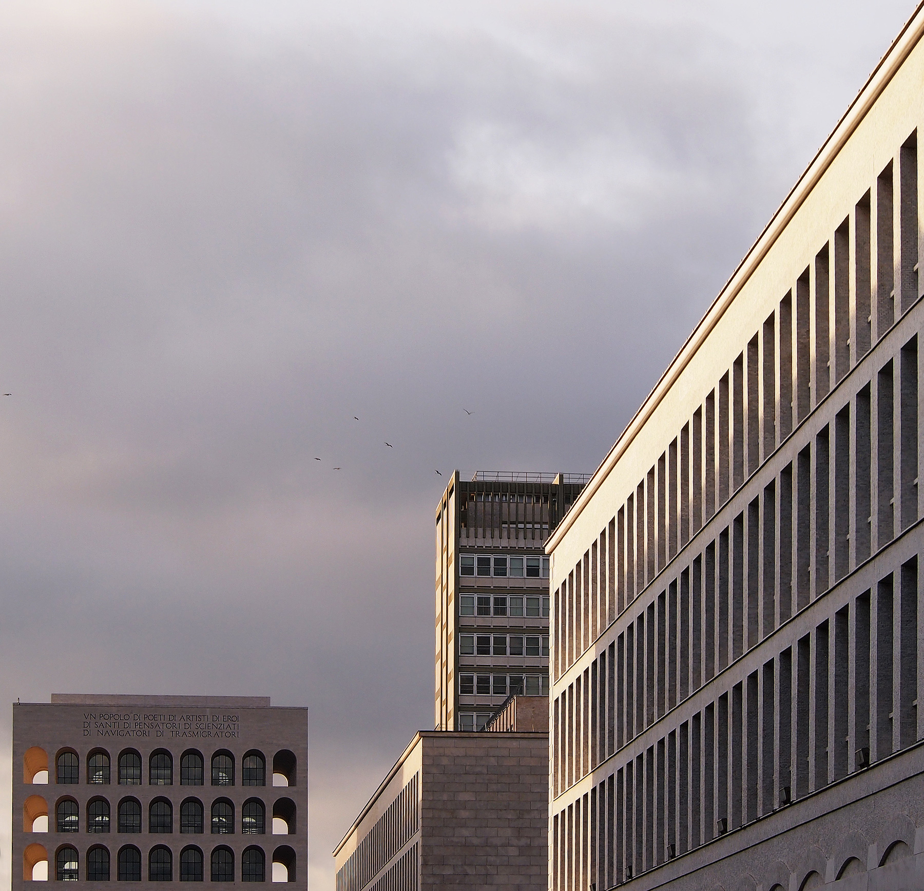 Composta col compasso..si direbbe. Aggiungo che hai colto anche un bel momento di luce che rende grafica e corposa anche la materia murale degli edifici Romani nella zona dell' Eur.