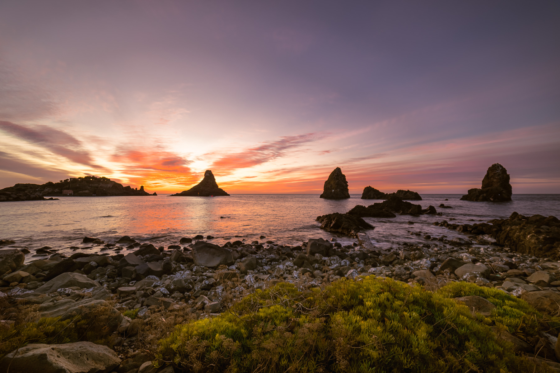 Acitrezza: veduta della Riserva naturale integrale "Isola Lachea e Faraglioni dei Ciclopi" all'alba del 3 aprile 2022