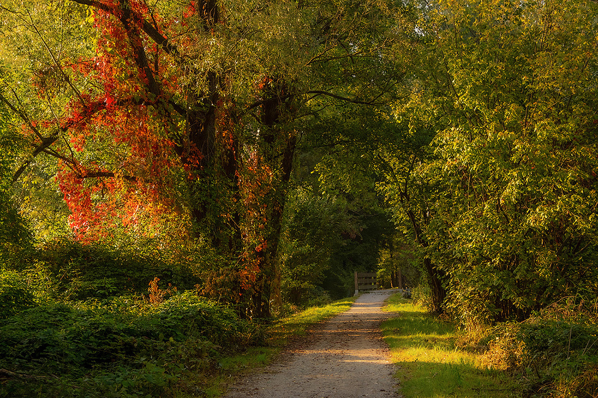 Un'ottima scelta il rosso che introduce l'arco naturale degli alberi. Una luce ben gestita che insieme alle ombre da profondità allo scatto. Una bella visione