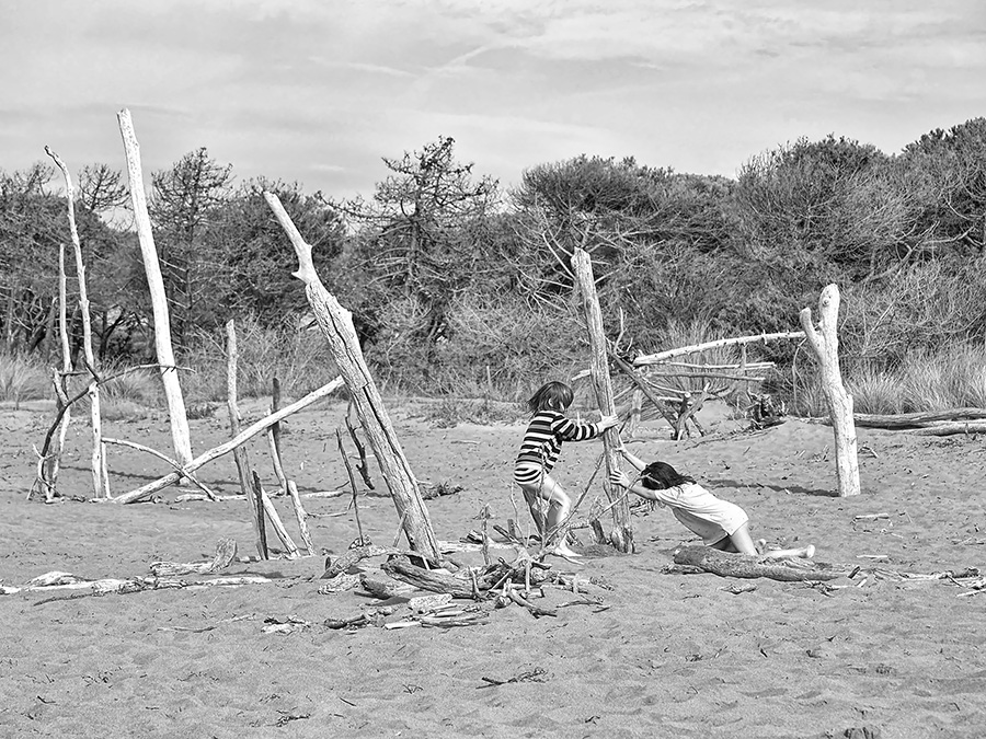 rami appuntiti, tronchi secchi e irti piantati nella sabbia, pezzi di legno sparsi un po' ovunque. la location contrasta nettamente con l'idea di gioco, di spensieratezza, di divertimento, eppure le due bimbe sono li a giocare, forse costruire qualcosa da questo insieme disordinato. Le hai colte nel momento dello sforzo, con i corpi contratti, il viso nascosto dai capelli. Il bn con ombre molto chiare è sicuramente una scelta.