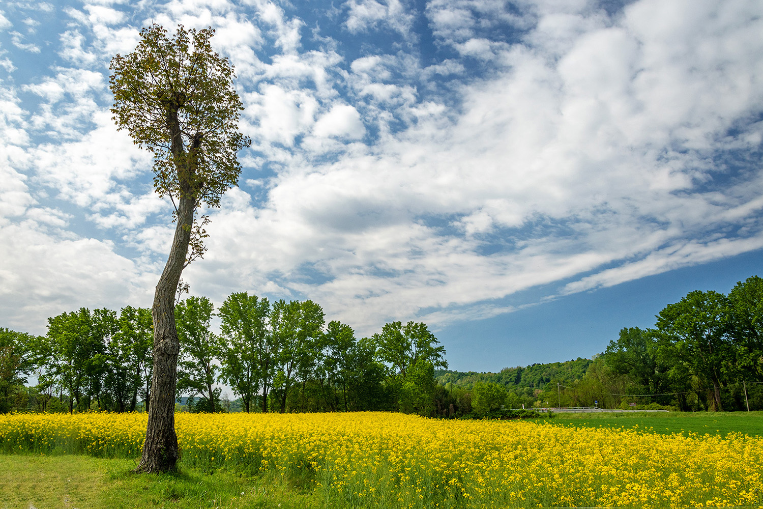 Un albero che sembra toccare le nuvole, un cielo dominato da una bella formazione di nuvole, una bella distesa di giallo..... Uno scatto godibilissimo