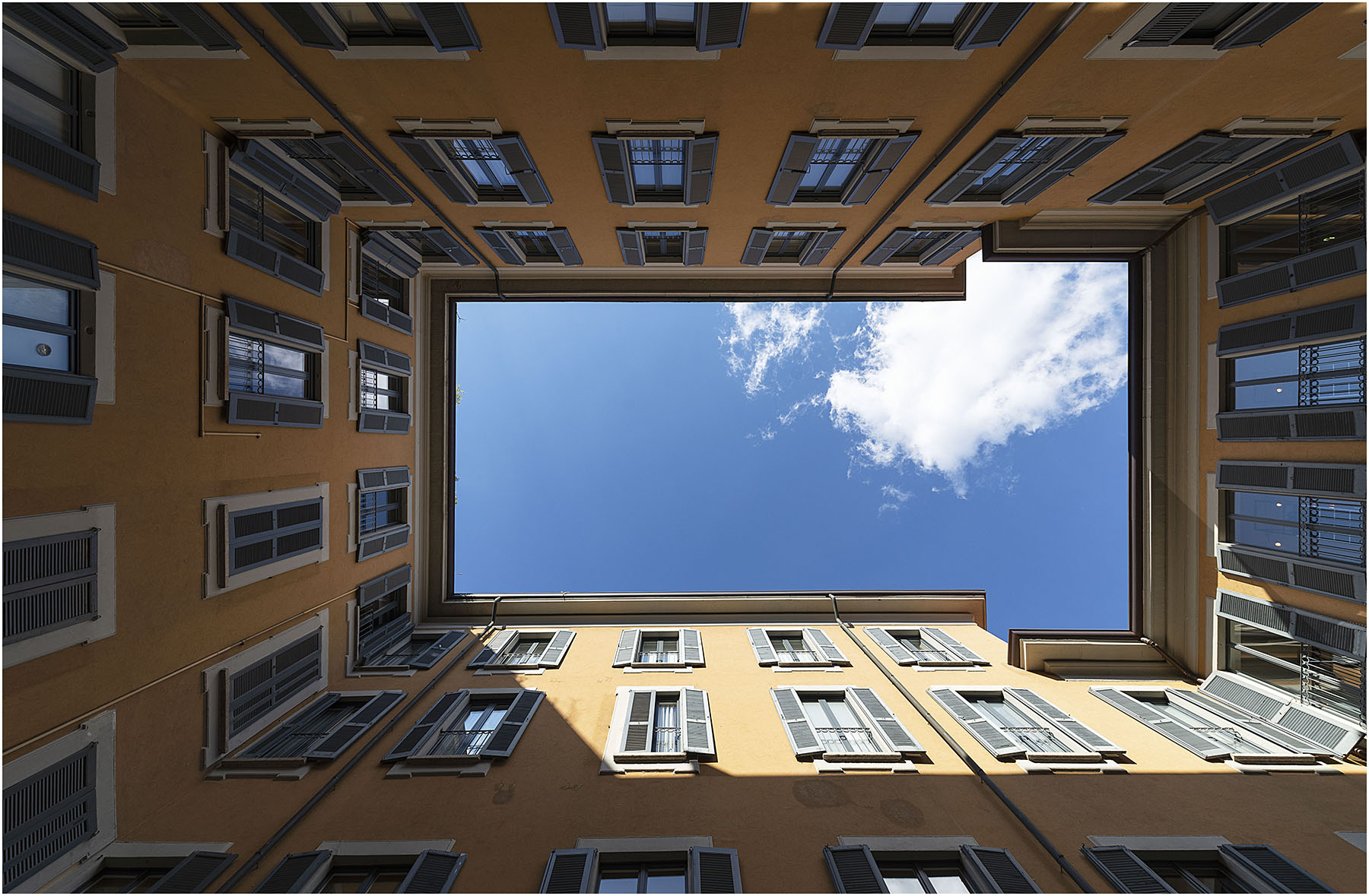 mi piacciono sempre queste immagini di cortili interni che incorniciano geometriche porzioni di cielo.