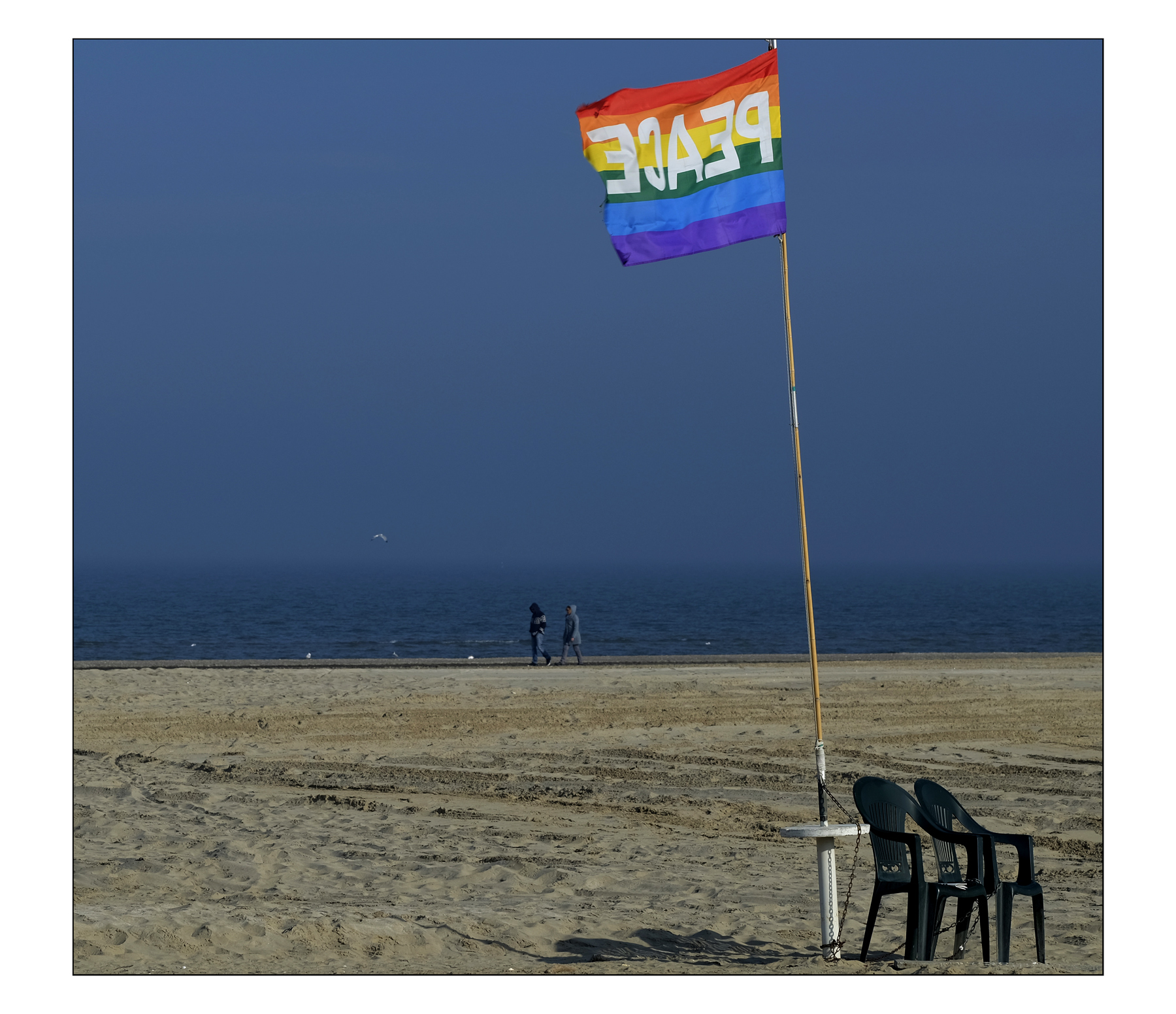 La bandiera sembra issata a sventolare in un contesto vuoto e desolato come quasi un "qualcosa" che stona pure.