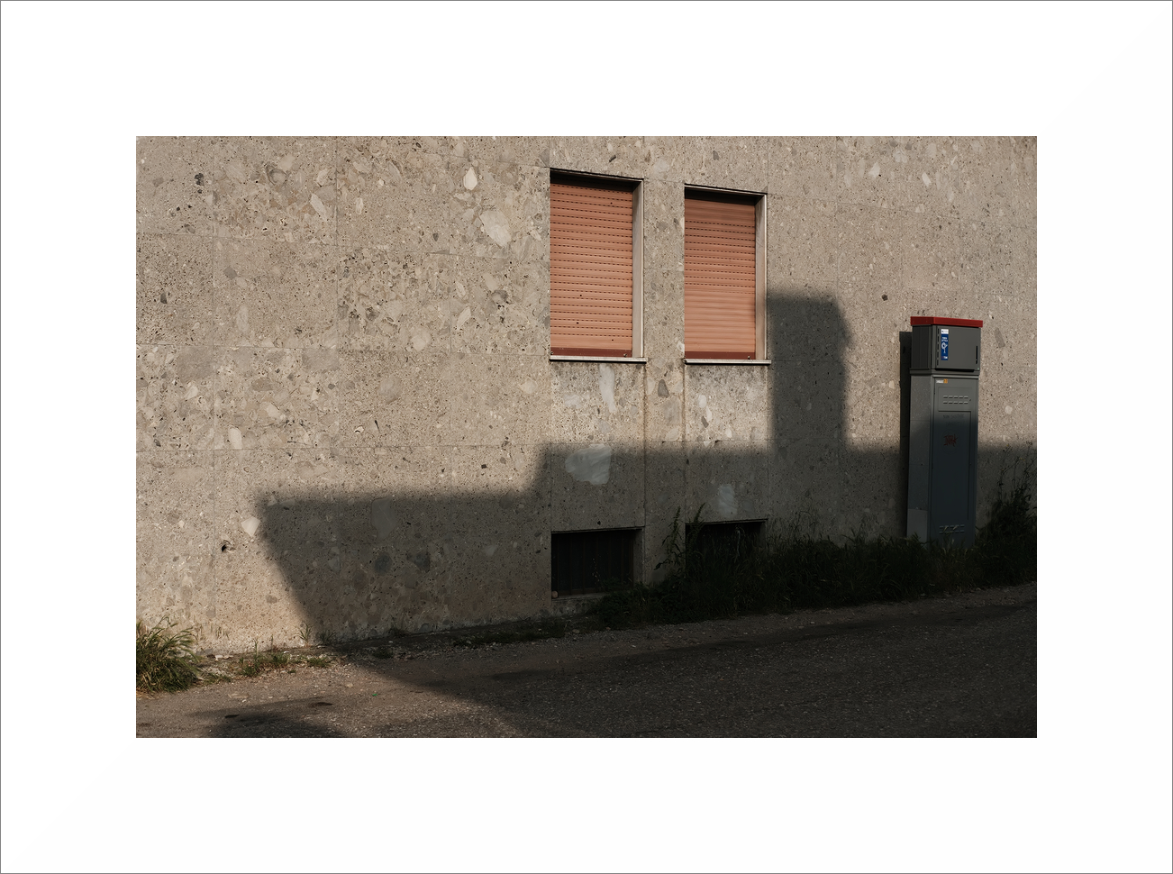 L'occhio attento ti ha permesso di vedere e proporci questa visione anomala ed estraniante in quanto in un contesto banalmente cittadino si individua chiaramente l'ombra di un probabile caseggiato di fronte con tanto di comignolo che però assume le forme che possono essere riferite chiaramente ad uno scafo nautico.