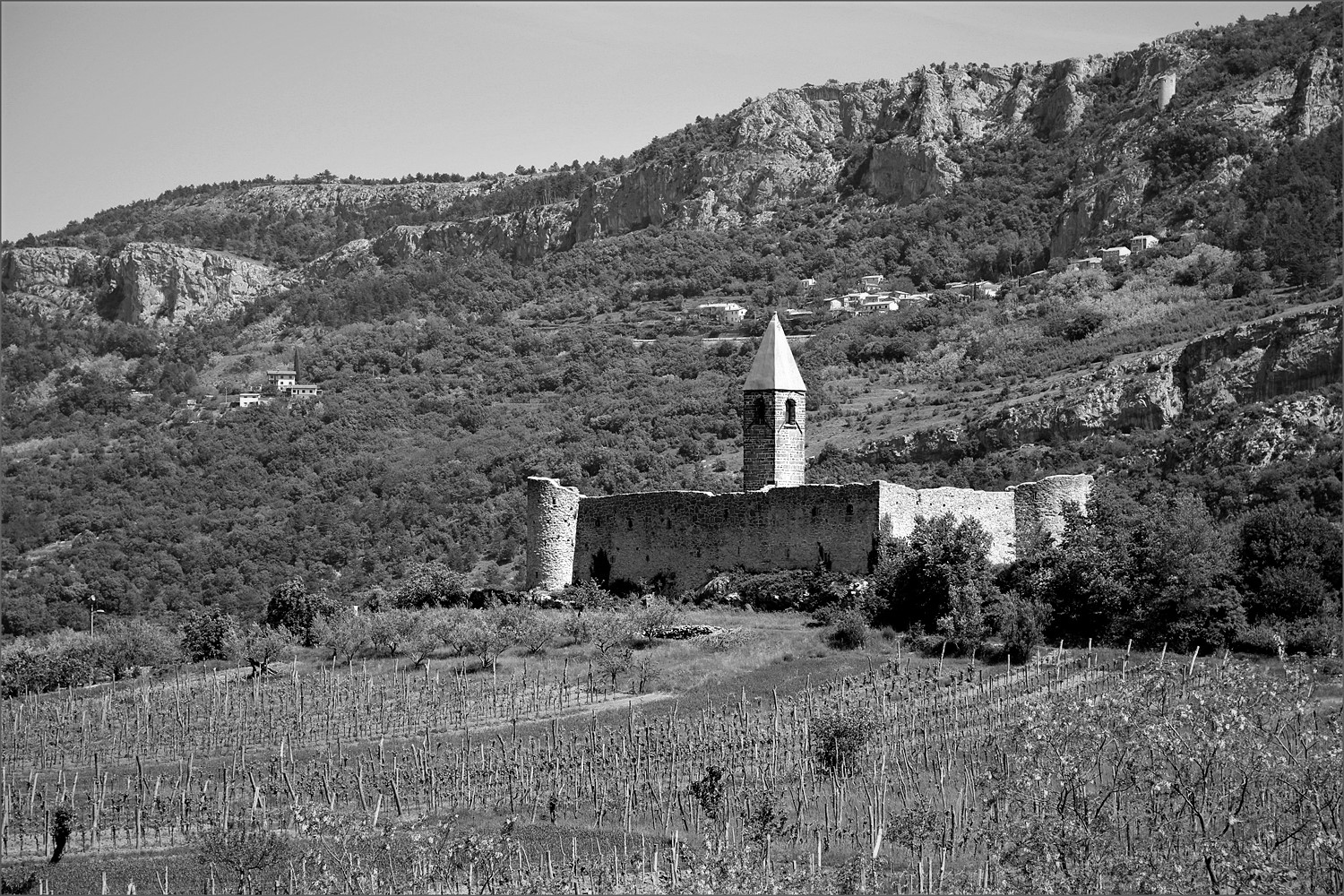 Piacevole ripresa di questa chiesina posta hai piedi della montagna, una buona immagine e BN. Ciao