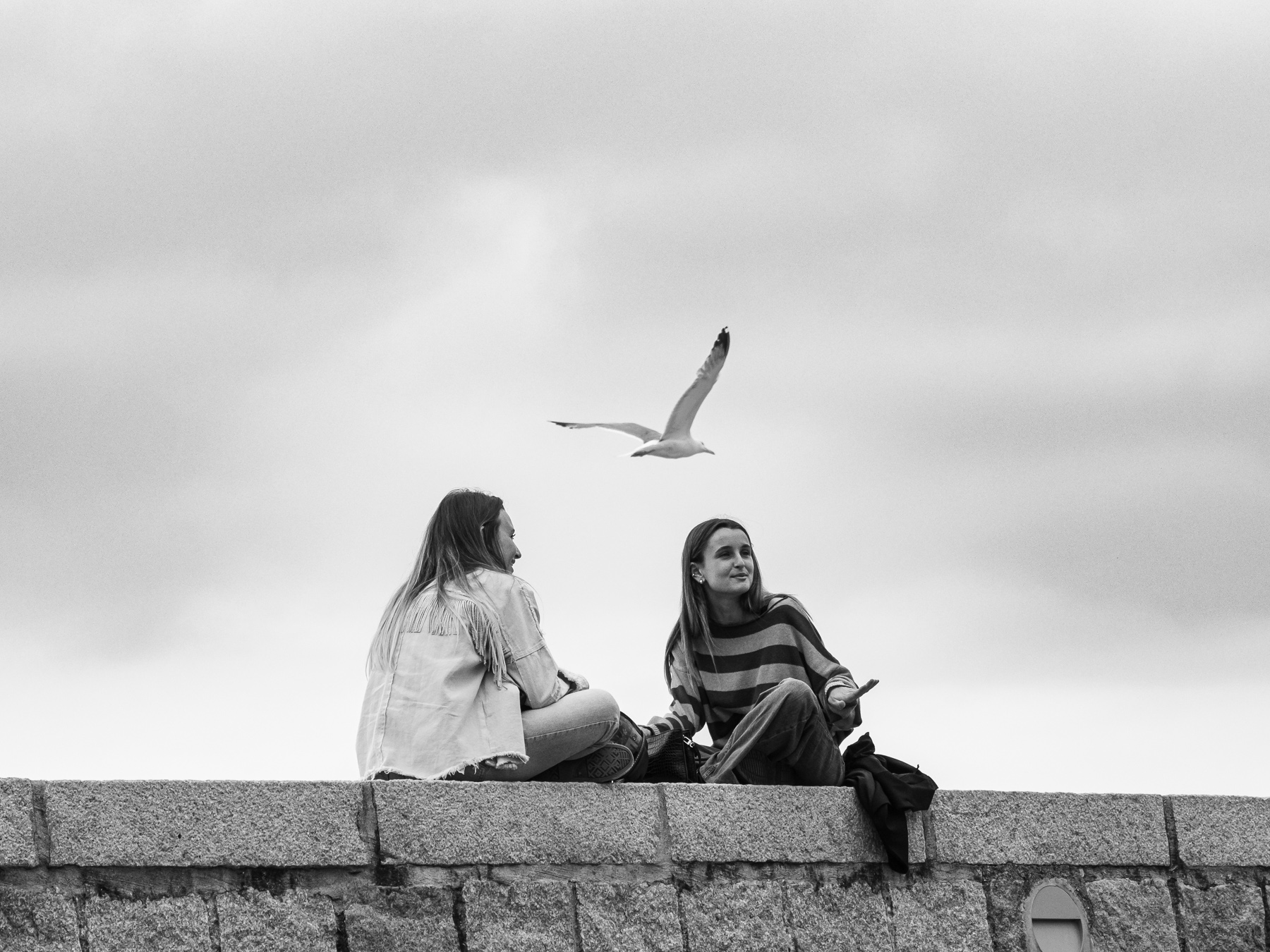 | Un momento di distrazione e socievolezza fra due amiche in un luogo magari un po' appartati e vicino al mare. Il gabbiano aggiunge un senso evocativo all'istantanea. Mi piace. Ciao, Tiziano |