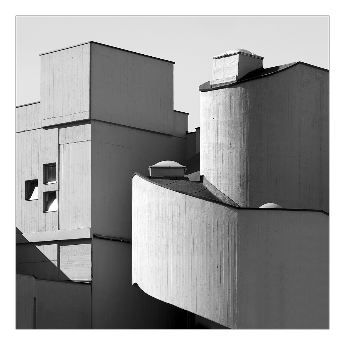 Il tipo di struttura e il tipo di inquadratura scelto si addicono al formato quadrato. Il bianco e nero sembra un po' velato nei grigi ma deve essere anche per rispecchiare il tipo di luce nel momento. Per me lo scatto funziona. Buona. Ciao, Tiziano