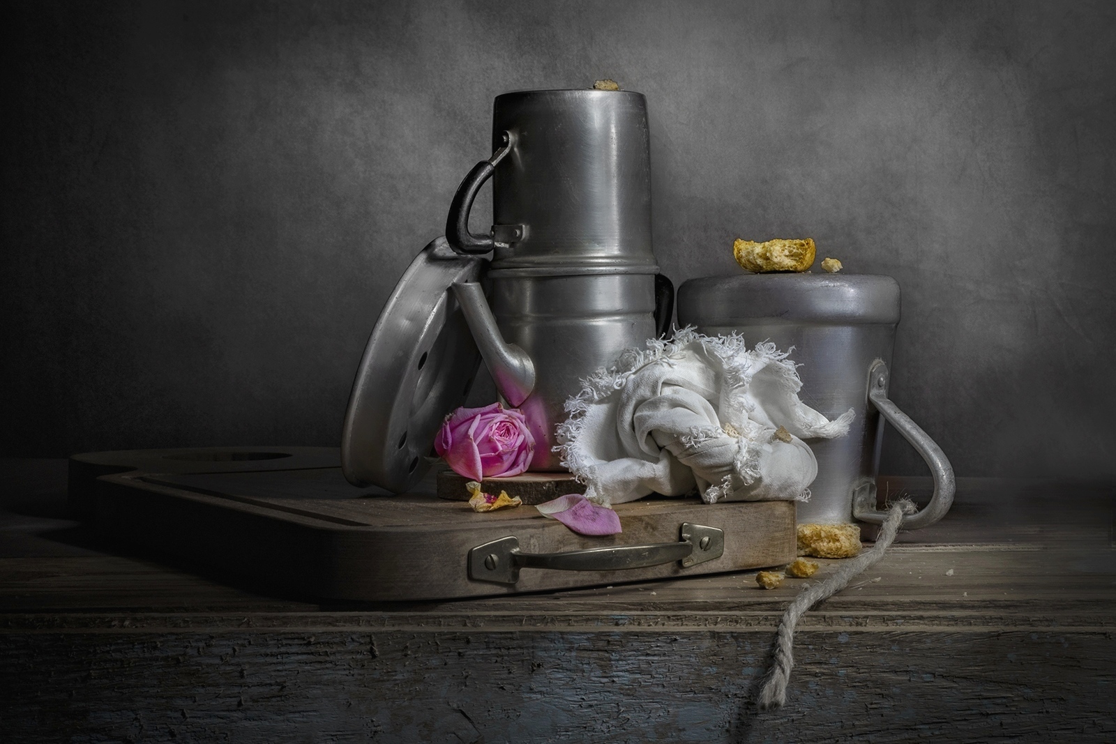Tiziano devi sapere che mi piace molto un fotografo, se non sbaglio inglese, ma vive a Milano da tanti anni, Christopher Broadbent. Ovviamente con le dovute "cautele" , ho cercato di avvicinarmi al suo stile. Oltre ai suoi still Life in bianco e nero e ai fiori appassiti, sono famosi anche questi scatti di tegami, brocche ,pezzi di pane raffermo e frutta marcia. Prova a dare un'occhiata in rete si suoi scatti.