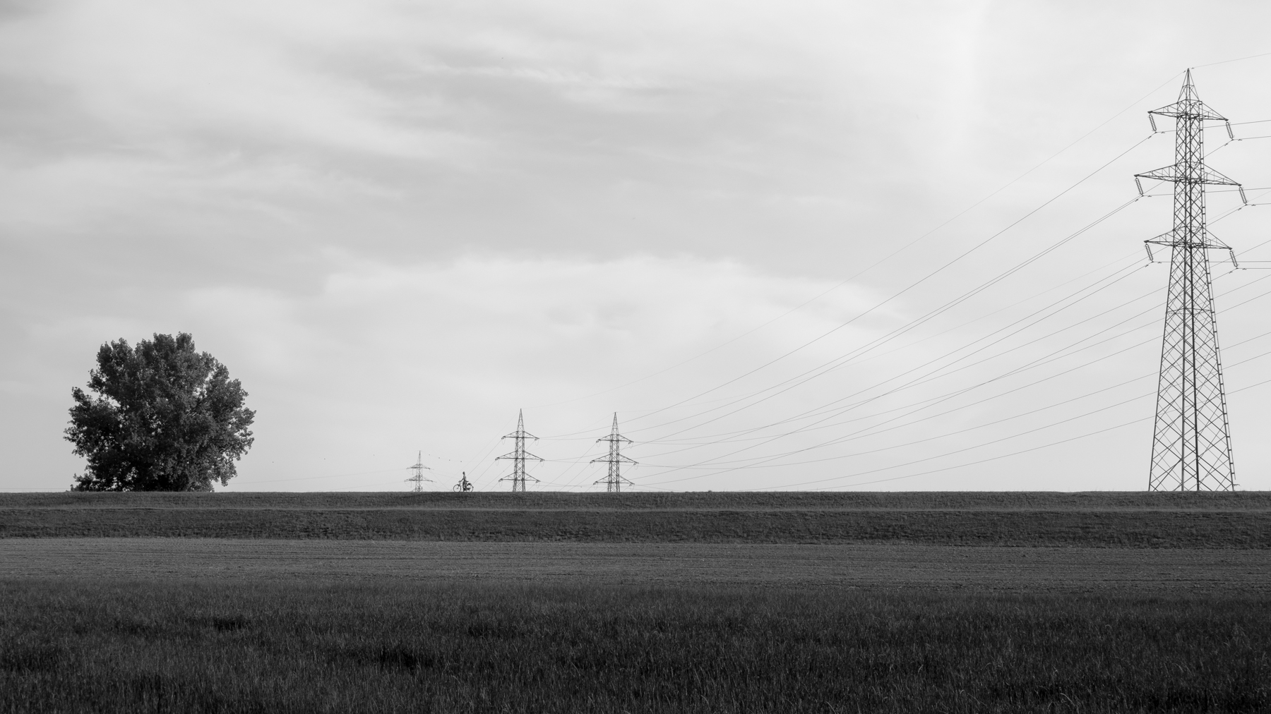 Si segue l'andamento dei tralicci dal più grande al più piccolo e proprio la dove le dimensioni si annullano ecco che fa capolino la bicicletta che in quella posizione non rimane insignificante di fronte ai titani.