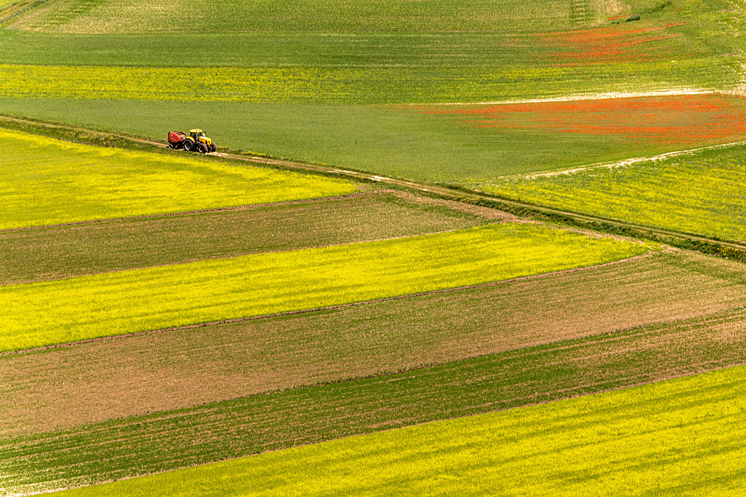Le geometrie dei campi, le pennellate di colore, la strada che taglia in diagonale i campi percorsi dal trattore, formano un'ottima composizione. Brava elis