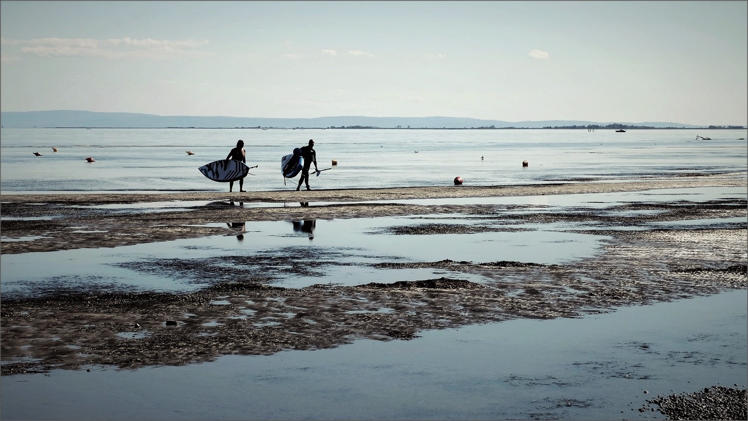 Una bella immagine in cui l'occhio dopo aver esplorato l'ottimo e interessante primo piano si posa su i due surfisti arricchiti dai loro riflessi per poi andare alle colline sullo sfondo. Scatto ben curato e piacevole