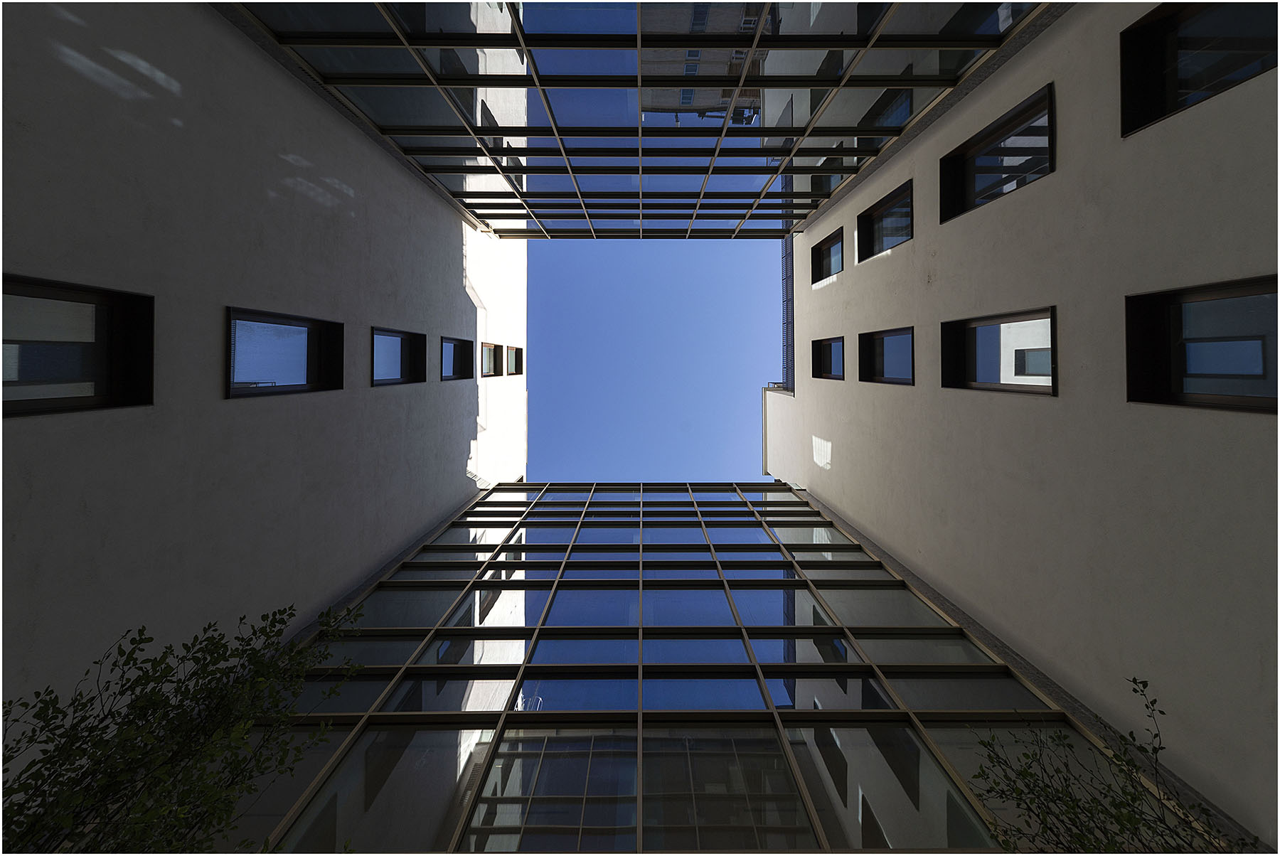 Un vertiginoso rincorrersi di forme quadrilatere protese verso il (quasi) quadrilatero di cielo.