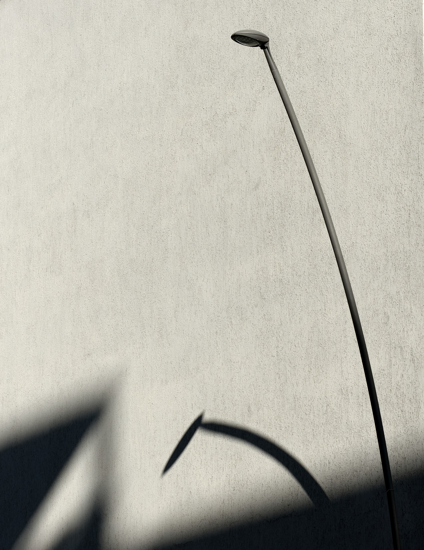 Sai Max che mi piace in modo particolare questo scatto? Su un muro, un po ruvido, si erge il lampione sopra le ombre che un po sfumate disegnano dei triangoli. Dal triangolo a dx spuntano in modo elegante il lampione con la sua lieve diagonale curva e un'altra ombra che ben si rapporta con il lampione. Il bianconero è ottimo a descrivere questa scena